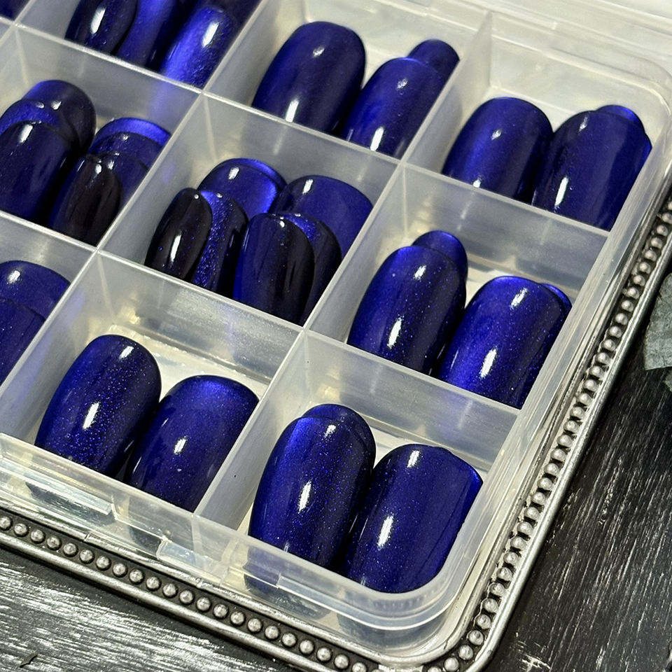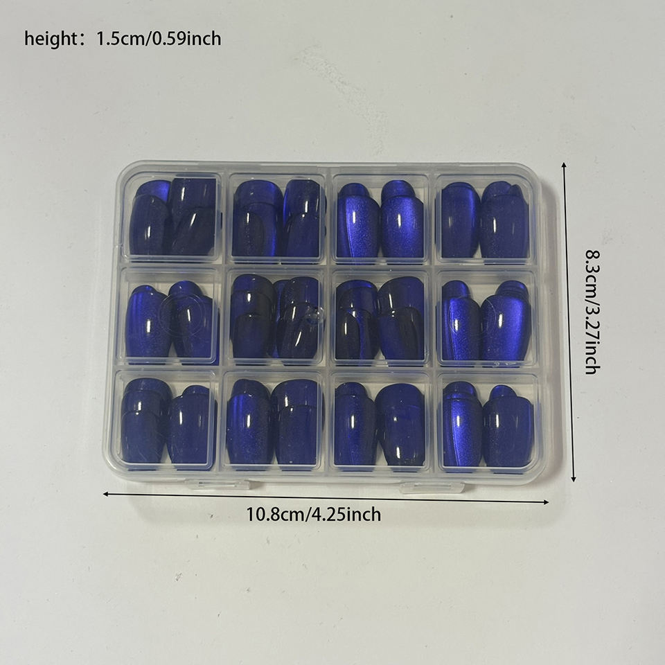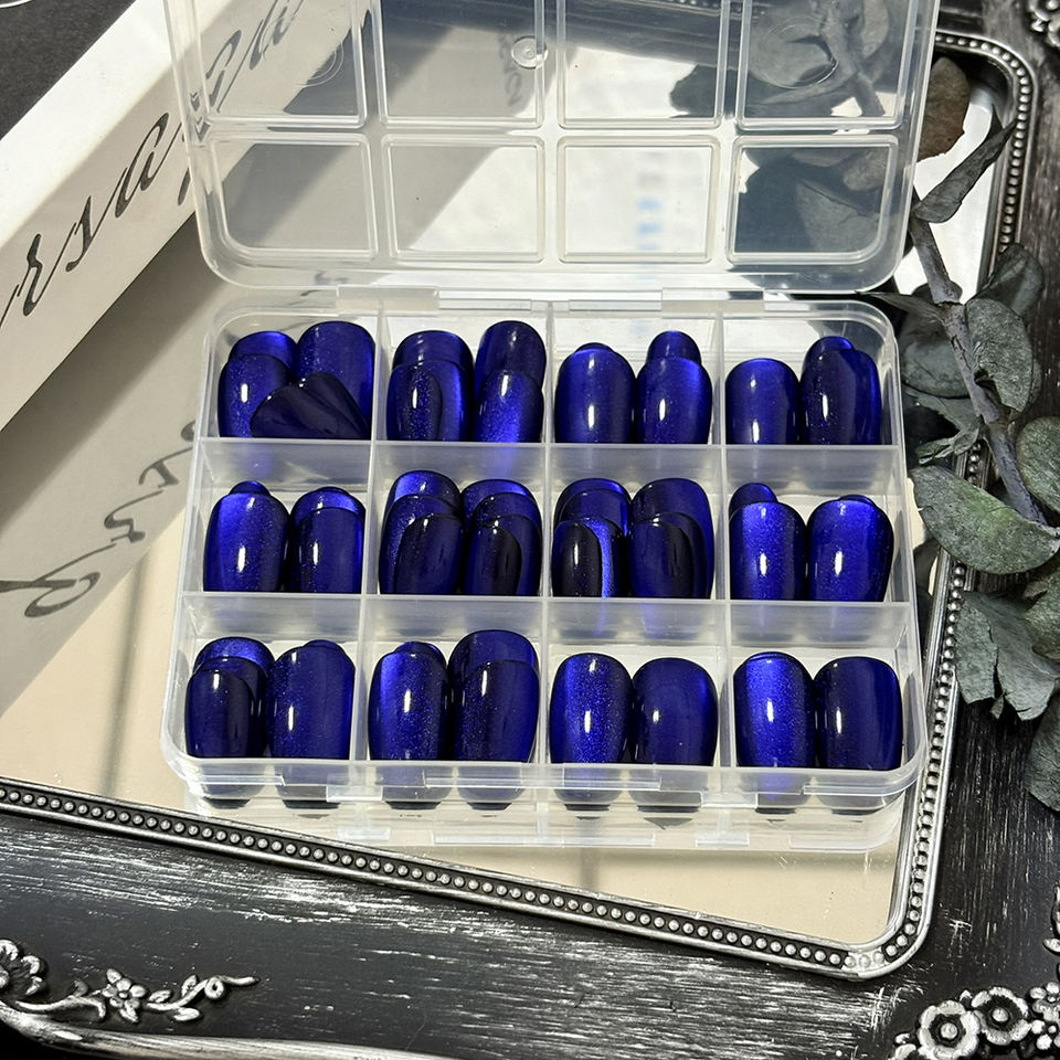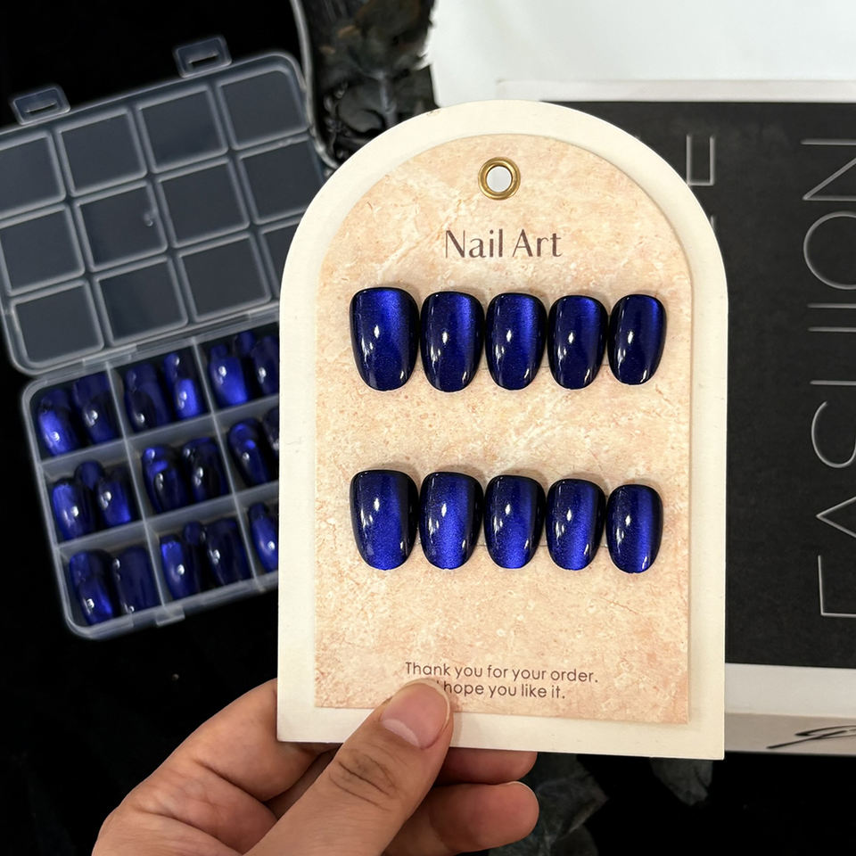 เล็บปลอมอะคริลิคแบบกดติด 144 ชิ้น สีน้ำเงินรอยัล ทรงรี ปลายเล็บทรงอัลมอนด์ ประดับกลิตเตอร์ ทำมือ ลายตาแมว ชุดเล็บปลอม