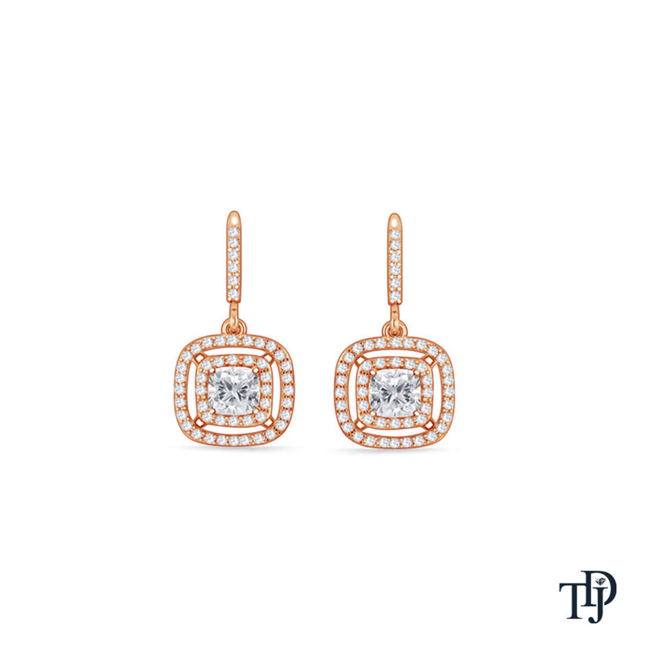 ต่างหูเพชรทรงคุชชั่นคัทแบบดับเบิ้ลฮาโล 14K ทองคำ ประดับเพชรเลี้ยงในห้องปฏิบัติการ