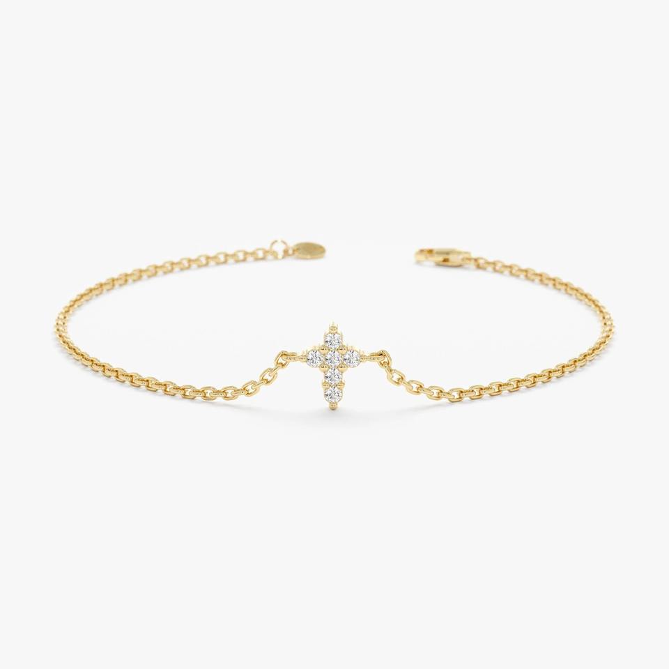 กำไลข้อมือทอง 14K ประดับเพชรรูปกากบาทขนาดเล็ก ดีไซน์เรียบหรู เหมาะเป็นของขวัญสำหรับพิธีรับศีลล้างบาปสำหรับผู้หญิง ได้รับการรับรองจาก IGI น้ำหนักเพชร 0.05 กะรัต พร้อมตัวล็อกแบบก้ามกุ้ง