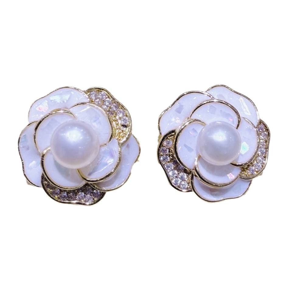 ต่างหูมุกน้ำจืดทรงดอกคามิลเลีย ดีไซน์เรโทร ประดับเพชรซิคอนเคลือบทอง 14K สำหรับผู้หญิง
