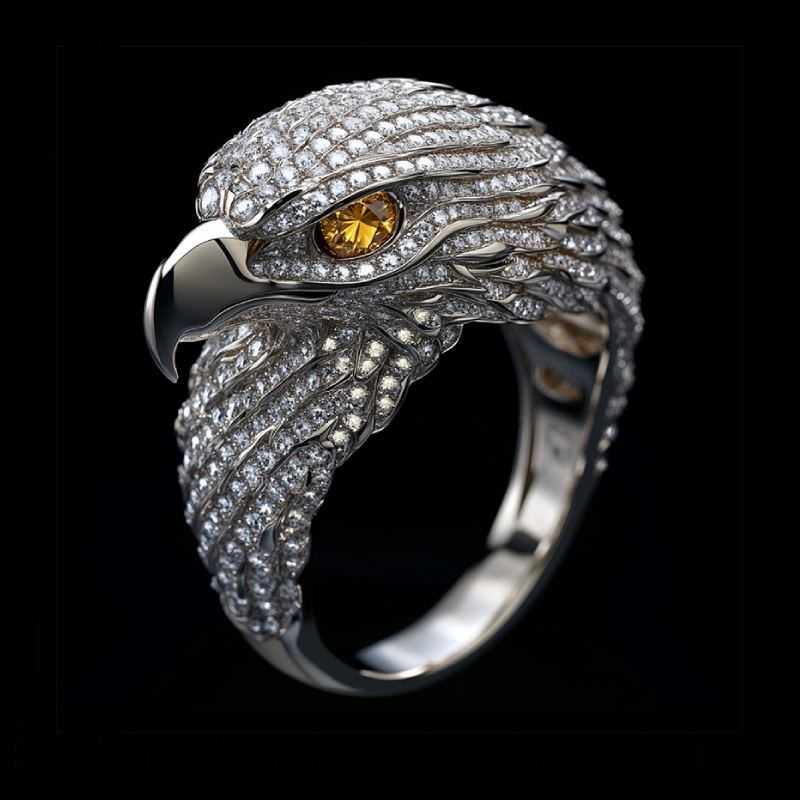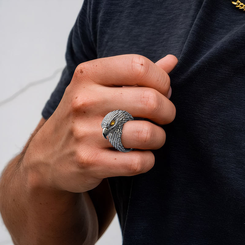แหวนทอง 14K รูปหัวนกอินทรีประดับเพชรโมอิสซาไนต์สำหรับผู้ชาย แหวนทองเหลืองสไตล์ฮิปฮอป ดีไซน์โดดเด่นรูปสัตว์ประดับเพชรแล็บ