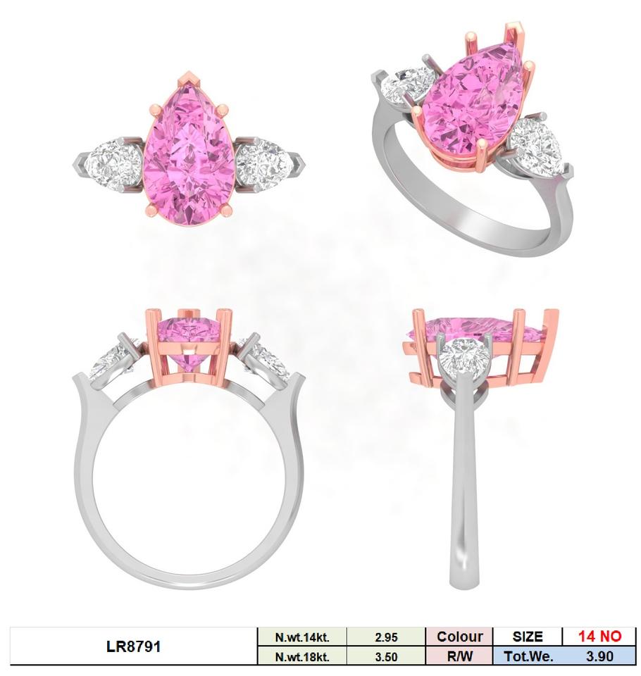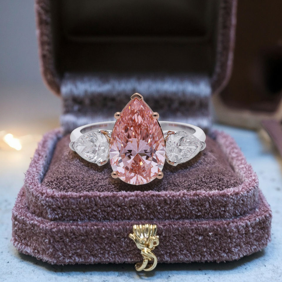 แหวนหมั้นเพชรเพาะเลี้ยง 14K ทองคำ 3 กะรัต ทรงลูกแพร์สีชมพู ประดับเพชรทรงลูกแพร์ด้านข้าง ชุบโรเดียม ได้รับการรับรองจาก IGI
