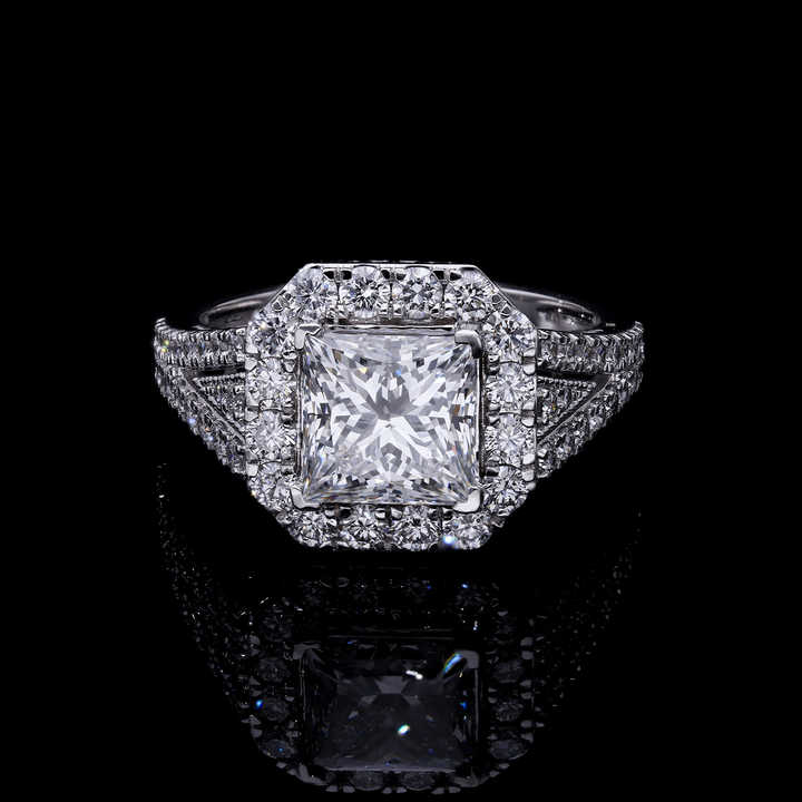 แหวนหมั้นเพชรแล็บโกรว์ 14K ทองคำ พร้อมเพชรทรงปรินเซสคัท 2 กะรัต ประดับด้วยเฮโลด้านข้างแบบแยกส่วน ได้รับการรับรองจาก IGI ชุบโรเดียม