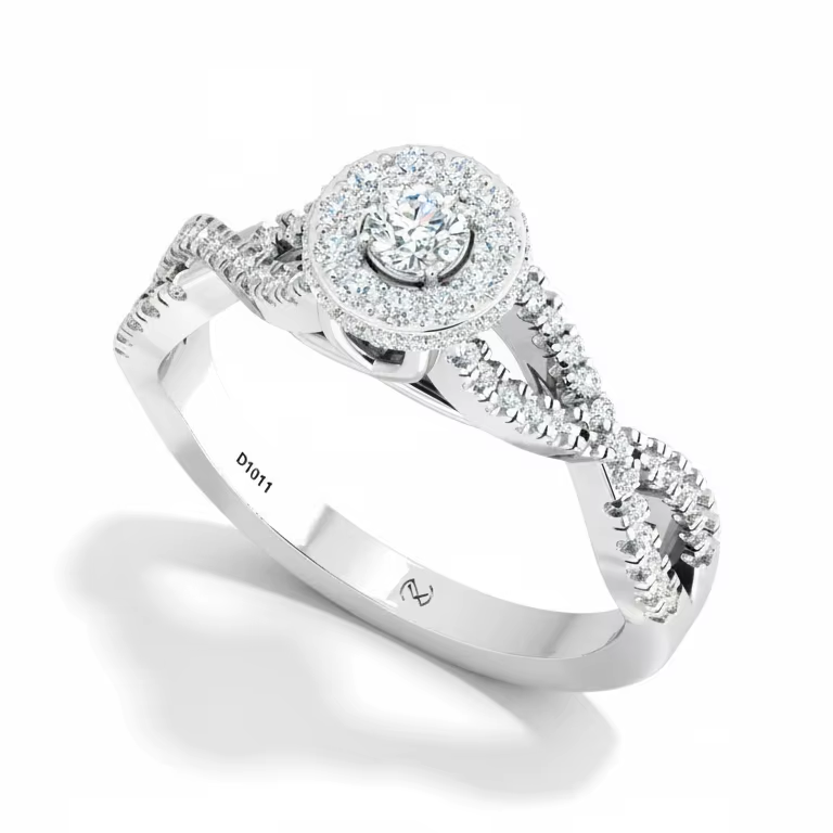 แหวนหมั้นทอง 14K ประดับเพชรทรงกลมธรรมชาติแบบดับเบิ้ลฮาโล ดีไซน์ก้านแหวนแยก แหวนเพชรคุณภาพสูง รับสั่งซื้อจำนวนมาก