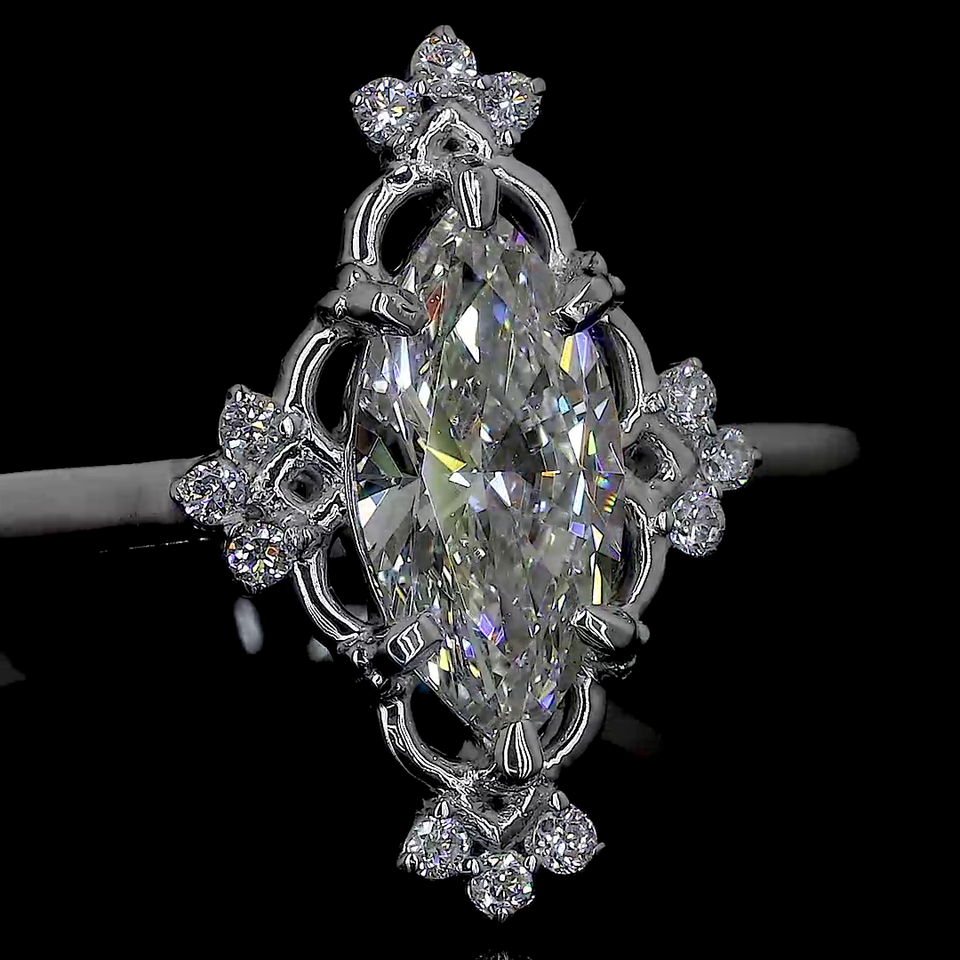แหวนหมั้นเพชรทรงมาร์คีส์เคลือบทอง 14K เพชรเลี้ยงในห้องปฏิบัติการ 1.20 กะรัต ด้านกลาง 0.40 กะรัต ด้านข้าง ฝังแบบหนามเตย ดีไซน์ลายดอกไม้ เพชร IGI
