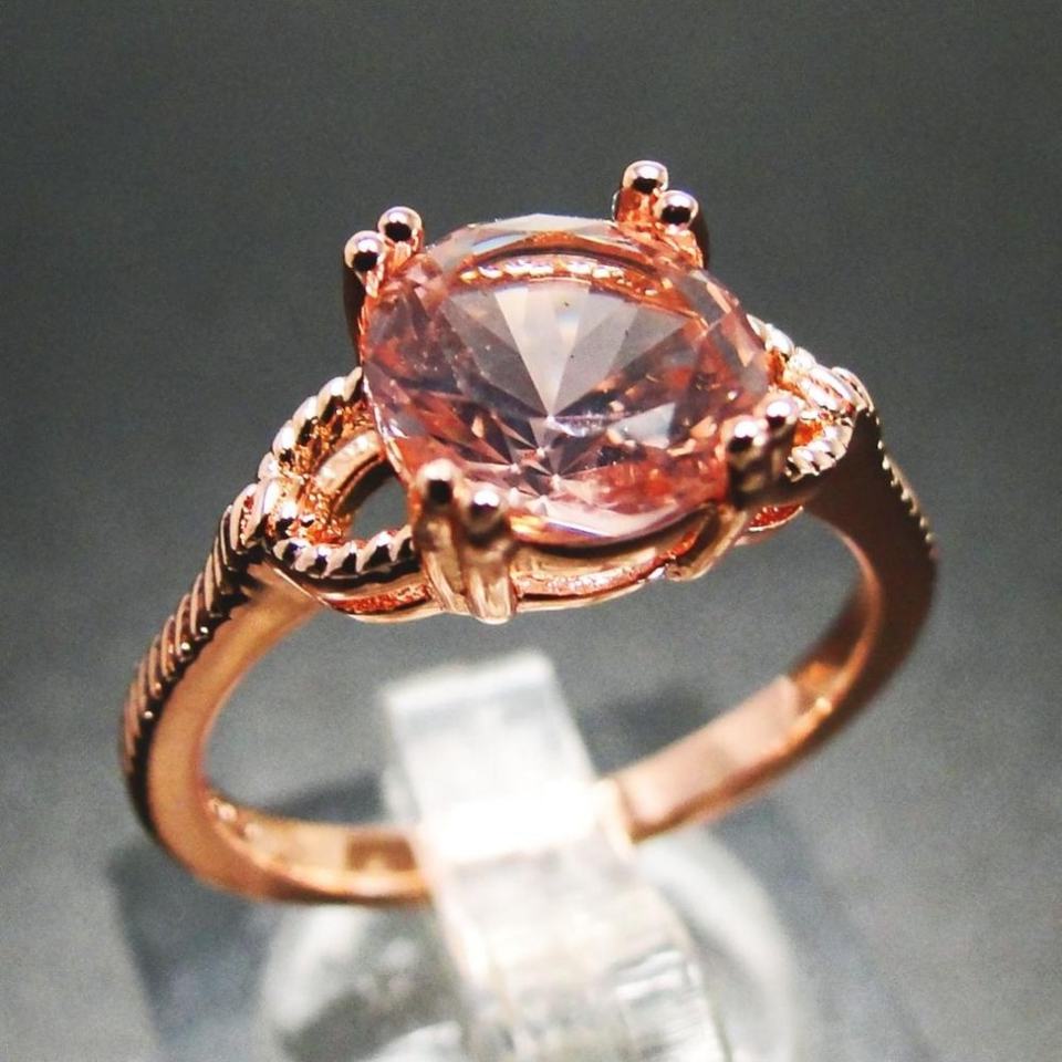 แหวนทองคำ 14K สีโรสโกลด์ ประดับมรกตสีชมพูทรงกลมขนาด 8 มม. แบบฝังหนามเตย สามารถสวมซ้อนกันได้