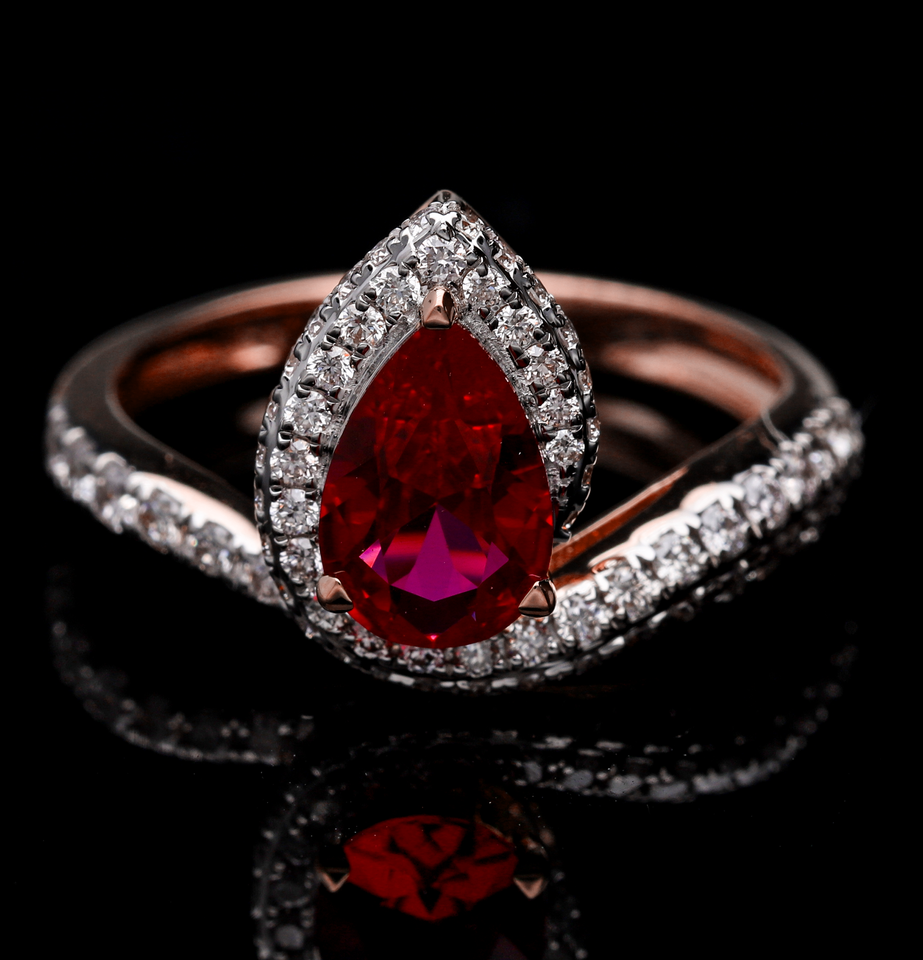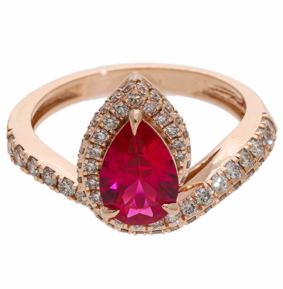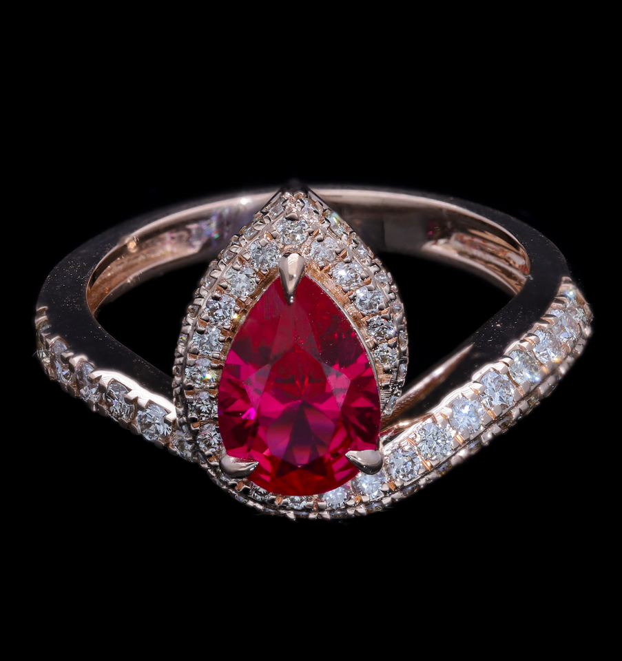 แหวนเพชรสีโรสโกลด์14k ประดับพลอยสีแดงรูปลูกแพร์มีเพชรทรงกลมธรรมชาติในการออกแบบรัศมีแบบแยกก้าน