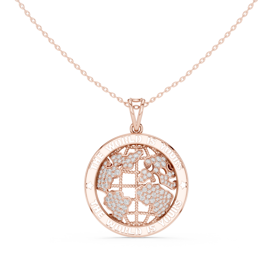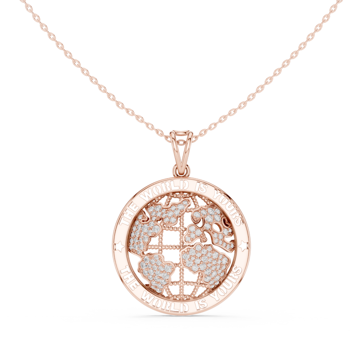 สร้อยคอจี้รูปแผนที่โลกประดับเพชรแล็บโกรว์ 14K โรสโกลด์ ดีไซน์ "โลกเป็นของคุณ" หรูหรา