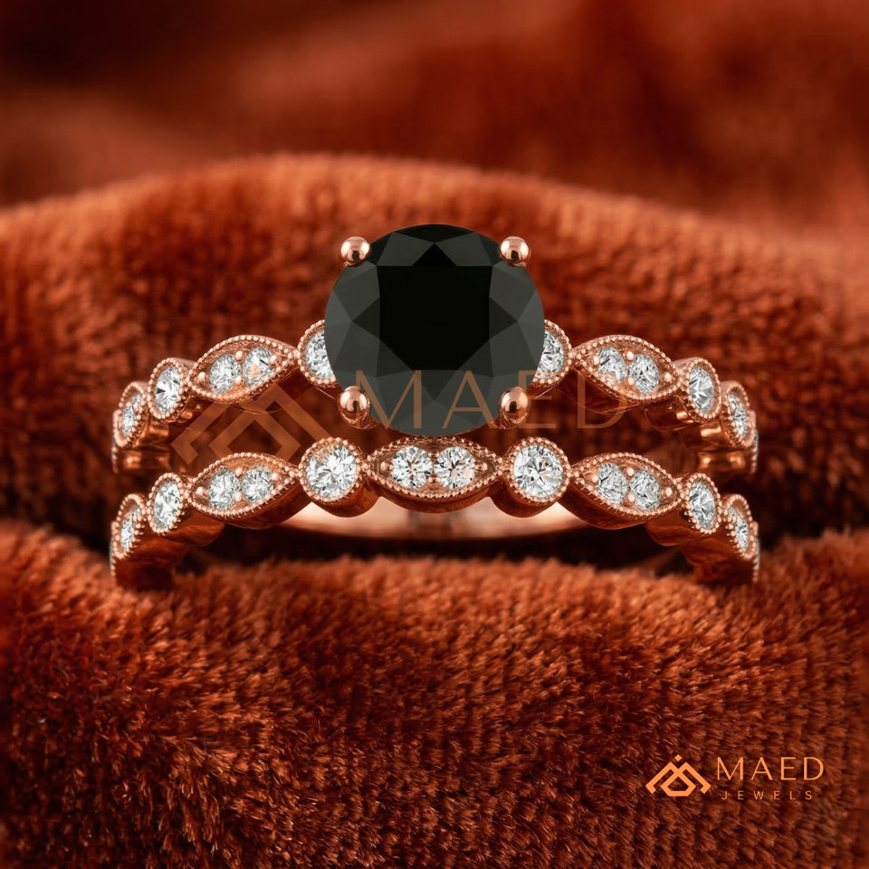 ชุดเครื่องประดับเจ้าสาวเงินแท้ 14K แหวนหมั้นเพชรโมอิสซาไนต์สีดำทรงกลม 2 กะรัต พร้อมแหวนคู่แบบวินเทจทรงมาร์คีส์ลายจุดมิลเกรน