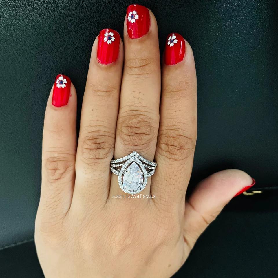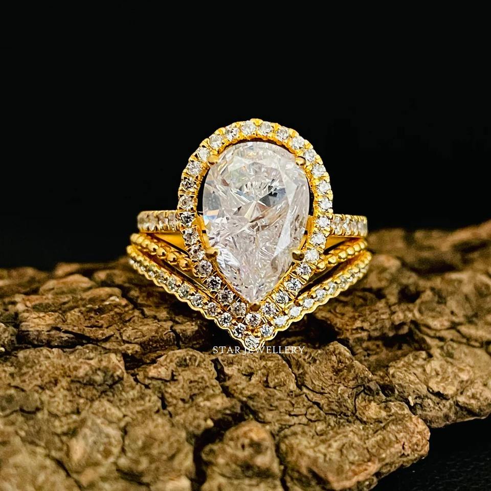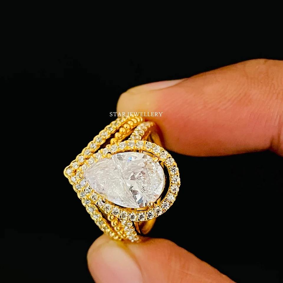 แหวนเพชรโมอิสซาไนต์ทรงอาร์ตเดคโคทรงลูกแพร์2กะรัตสีทอง14K แหวนเพชรโมอิสซานไนต์ตัดลูกแพร์