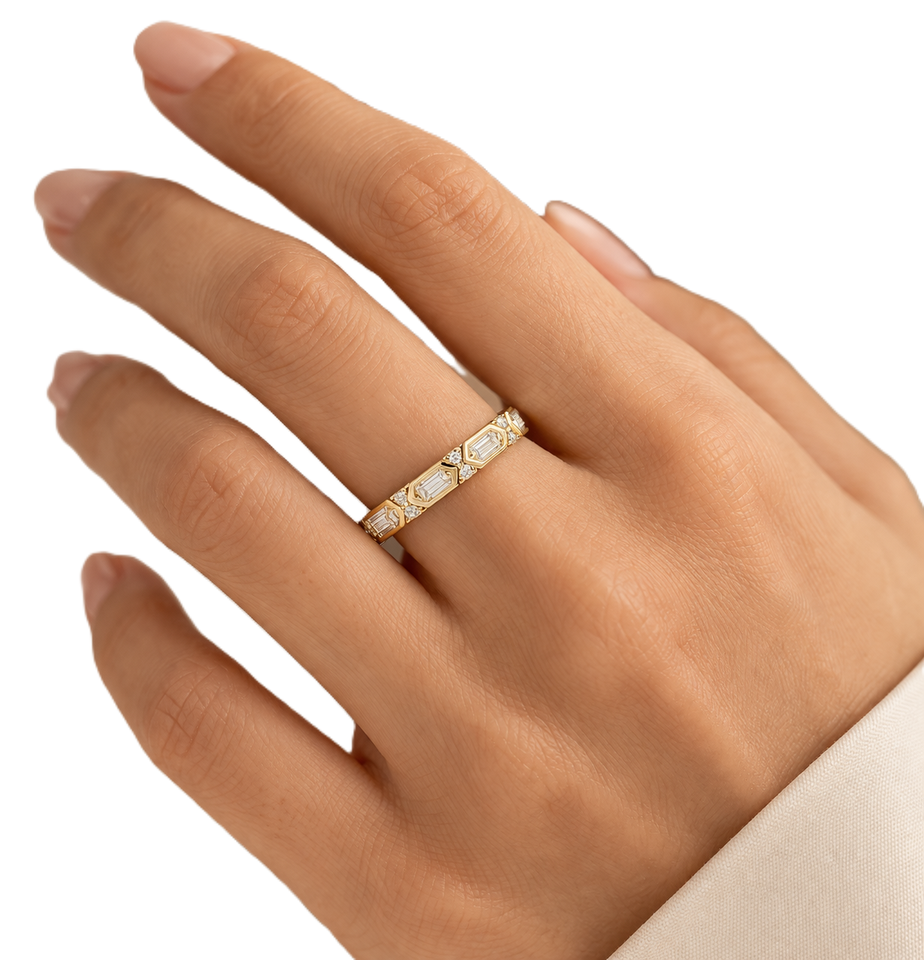 แหวนแต่งงานแบบซ้อนได้ วินเทจ ลายมิลเกรน ทองคำแท้ 14K ประดับเพชรทรงบาแกตต์และทรงกลม แหวนเพชรเพาะเลี้ยงสำหรับวันครบรอบ