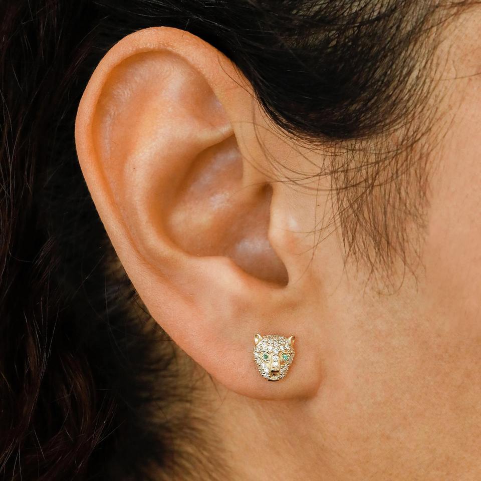 ต่างหูเม็ดเดี่ยวรูปเสือดำสีทอง14K ต่างหูเพชรแบบเม็ดเดี่ยวเคลือบมรกต