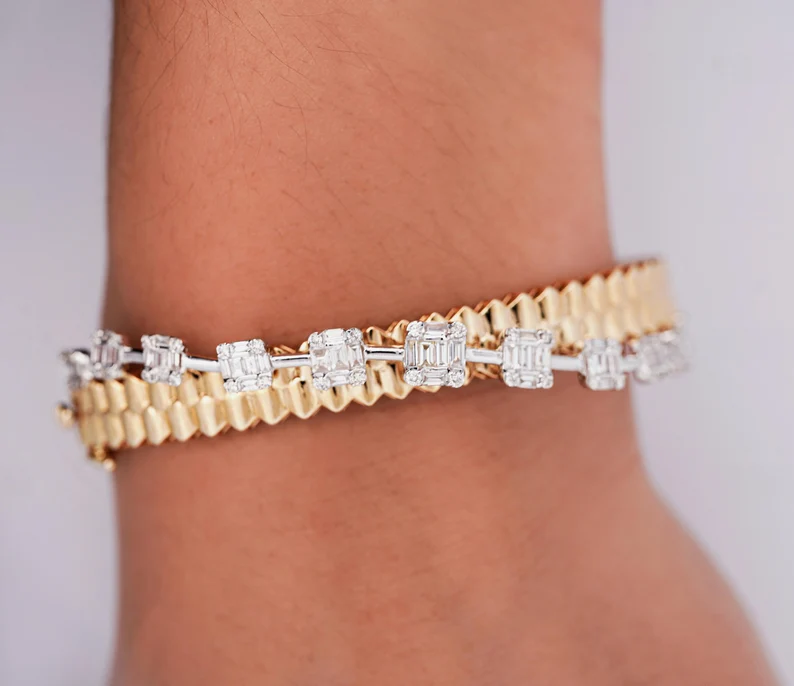 กำไลเพชรหุ้มทองแท้14K แข็งสำหรับผู้หญิงเครื่องประดับแฟชั่นสำหรับงานแต่งงานพร้อมชุดภาพลวงตาวัสดุหลักอัลลอยชุบทอง