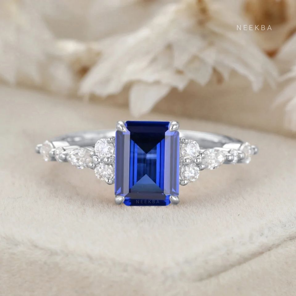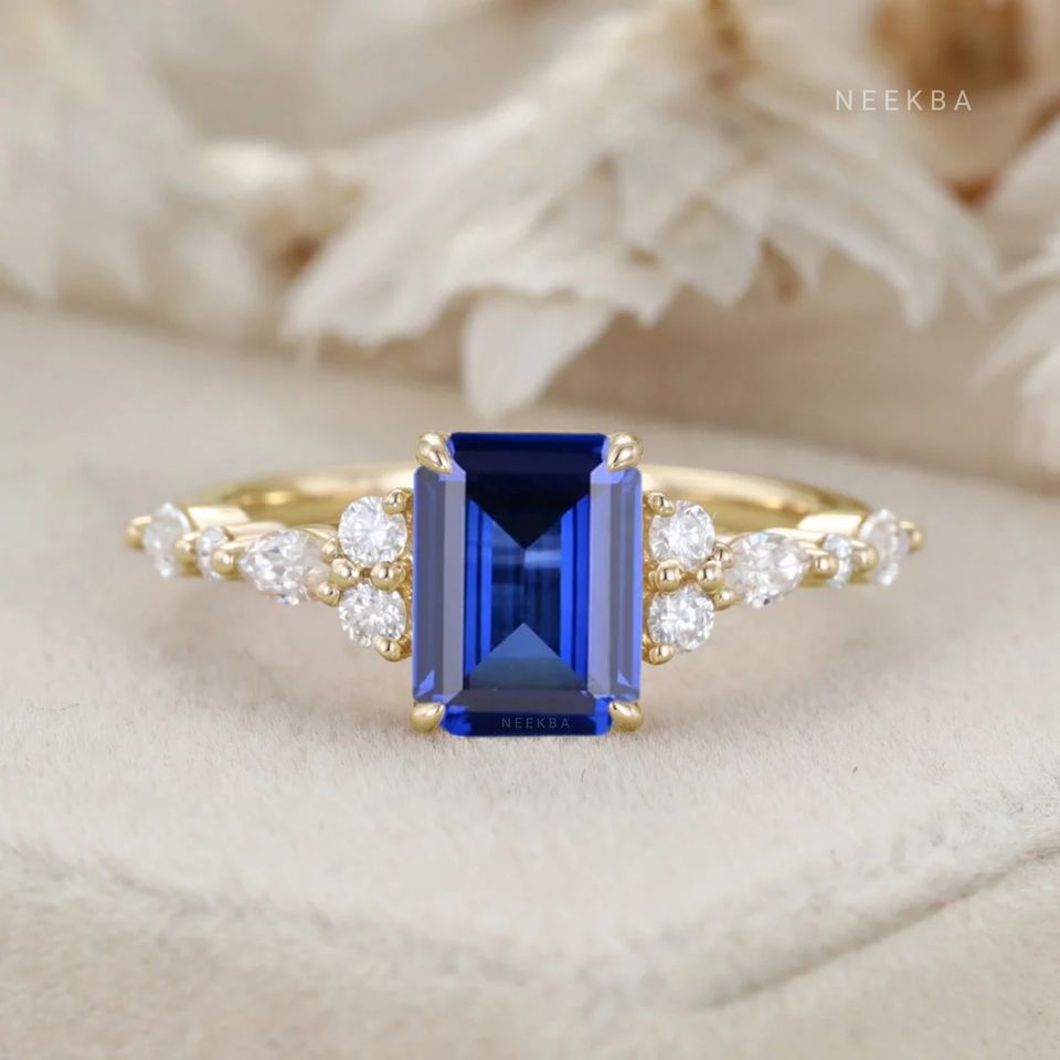 14K แหวนพลอยแซฟไฟร์สีโรสโกลด์ตกแต่งสไตล์อาร์ตเดคโคสีฟ้าและเพชรโมอิสซาไนต์พร้อมตัวเลือกการเปลี่ยนโทนสีโลหะ