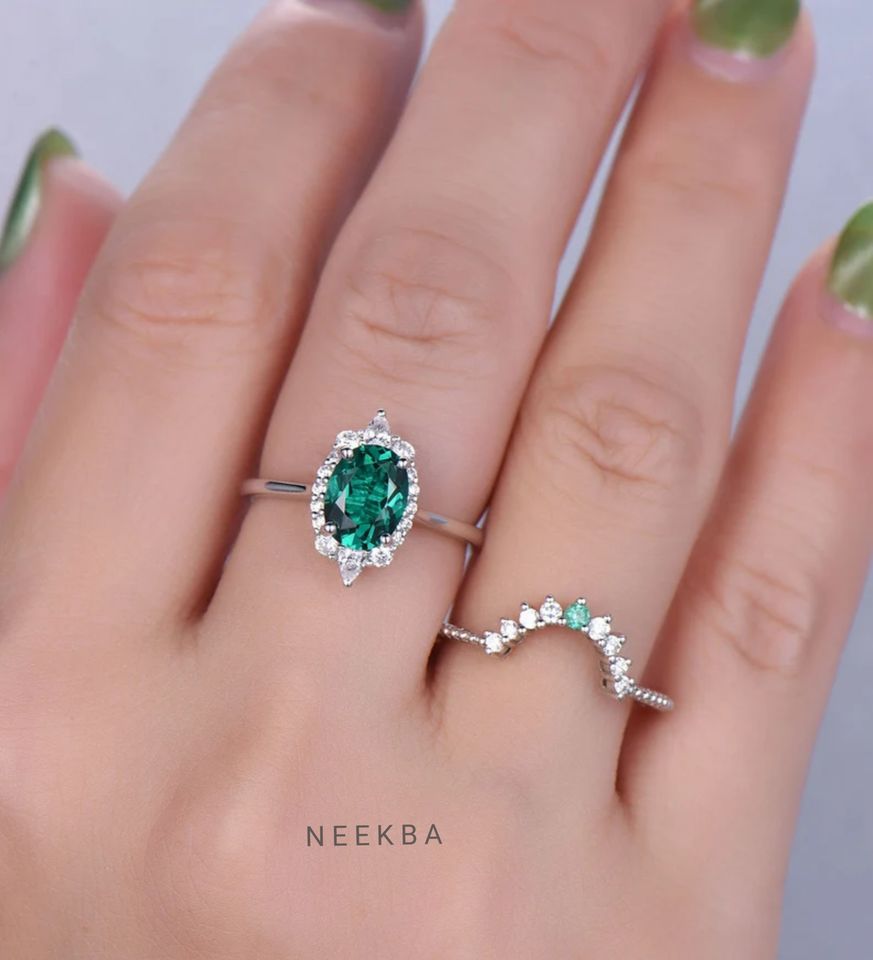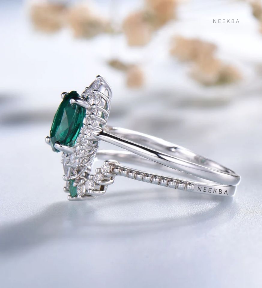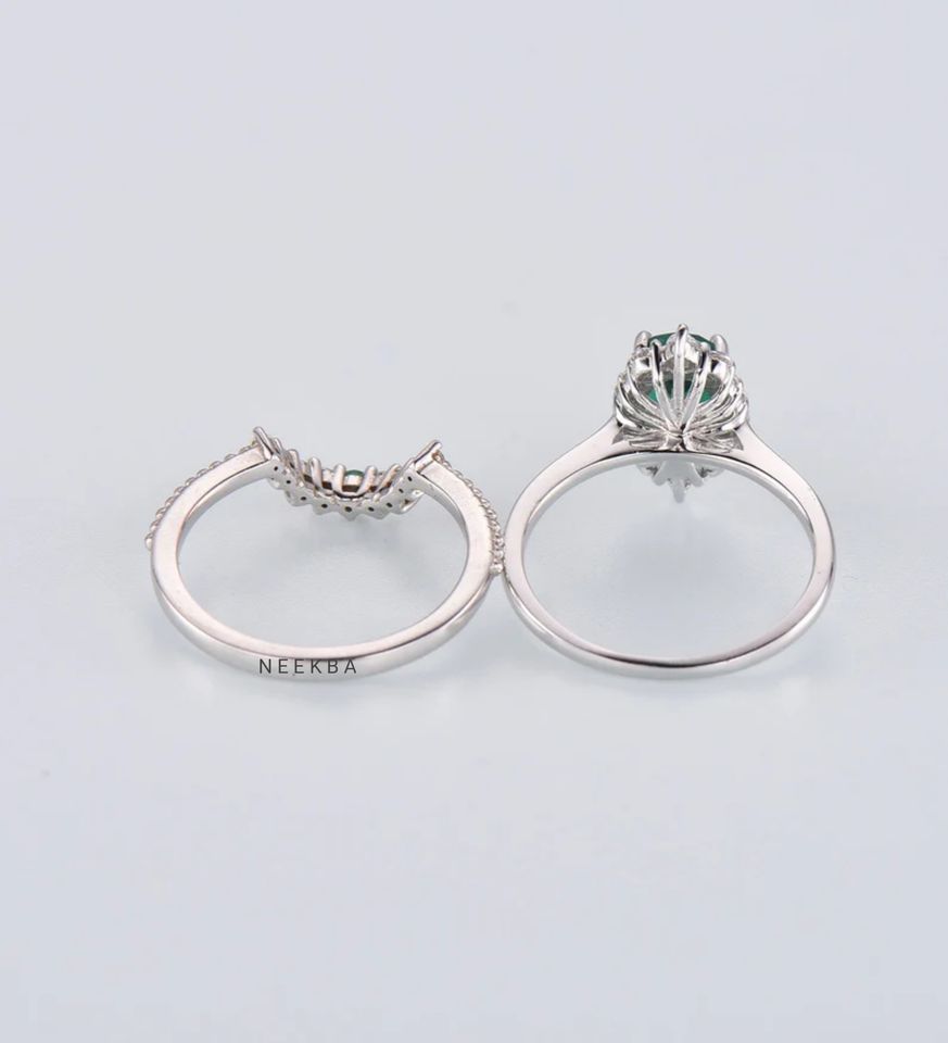 ชุดแหวนเจ้าสาว2ชิ้นสีทองขาว14K พร้อมมรกตและเพชรโมอิสซาไนต์ทรงวงรีเครื่องประดับสำหรับเจ้าสาวตามสั่งจากอินเดีย