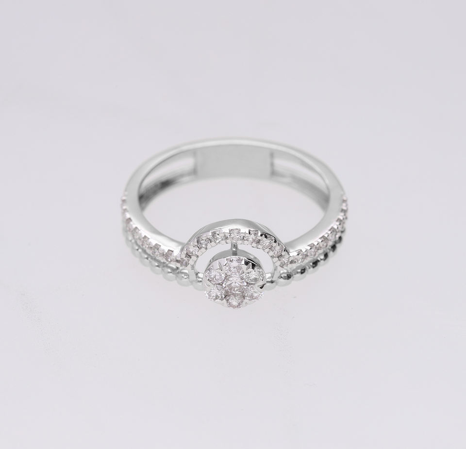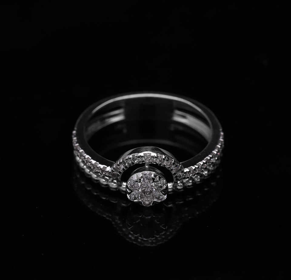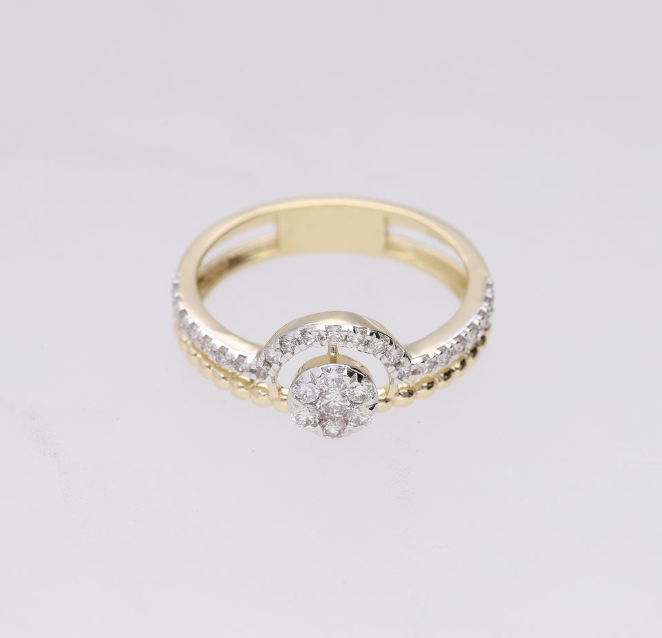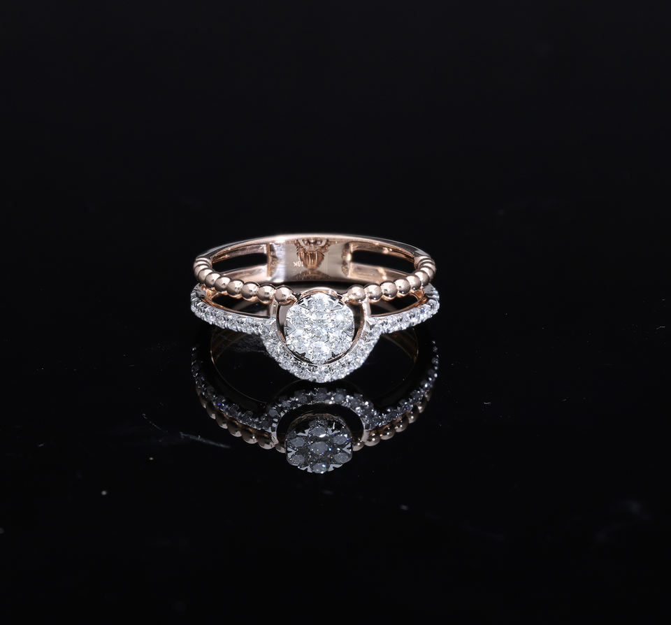 แหวนเพชรธรรมชาติสีทองทูโทน14K ที่มีการออกแบบสองแถบตรงกลางทรงกลมโดยเน้นเพชรและลูกปัด
