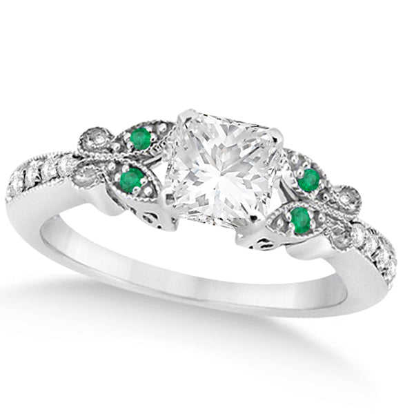 แหวนหมั้นผีเสื้อประดับเพชรทรงเจ้าหญิง 0.50 กะรัต และมรกต ทองคำขาว 14K ชุบโรเดียม พร้อมใบรับรอง IGI