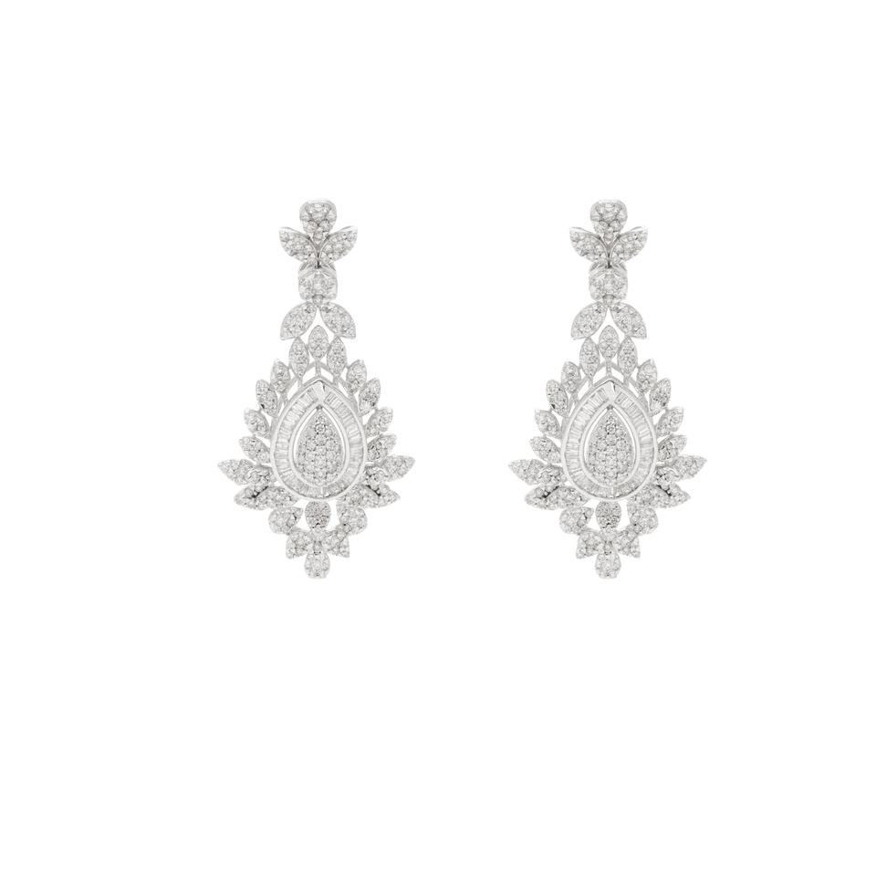 ต่างหูห้อยทรงสมมาตรชุบโรเดียมทองคำ 14K ประดับเพชรธรรมชาติทรงกลมเจียระไนแบบบริลเลียนท์