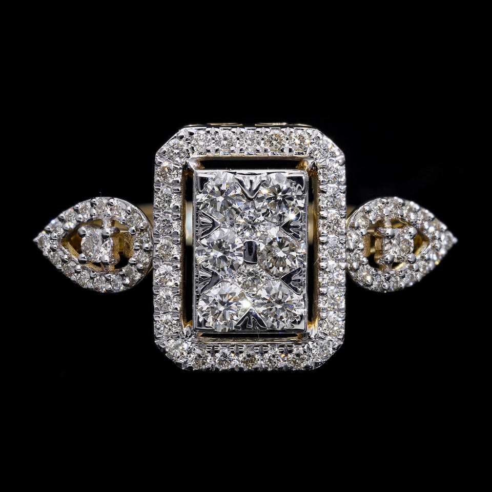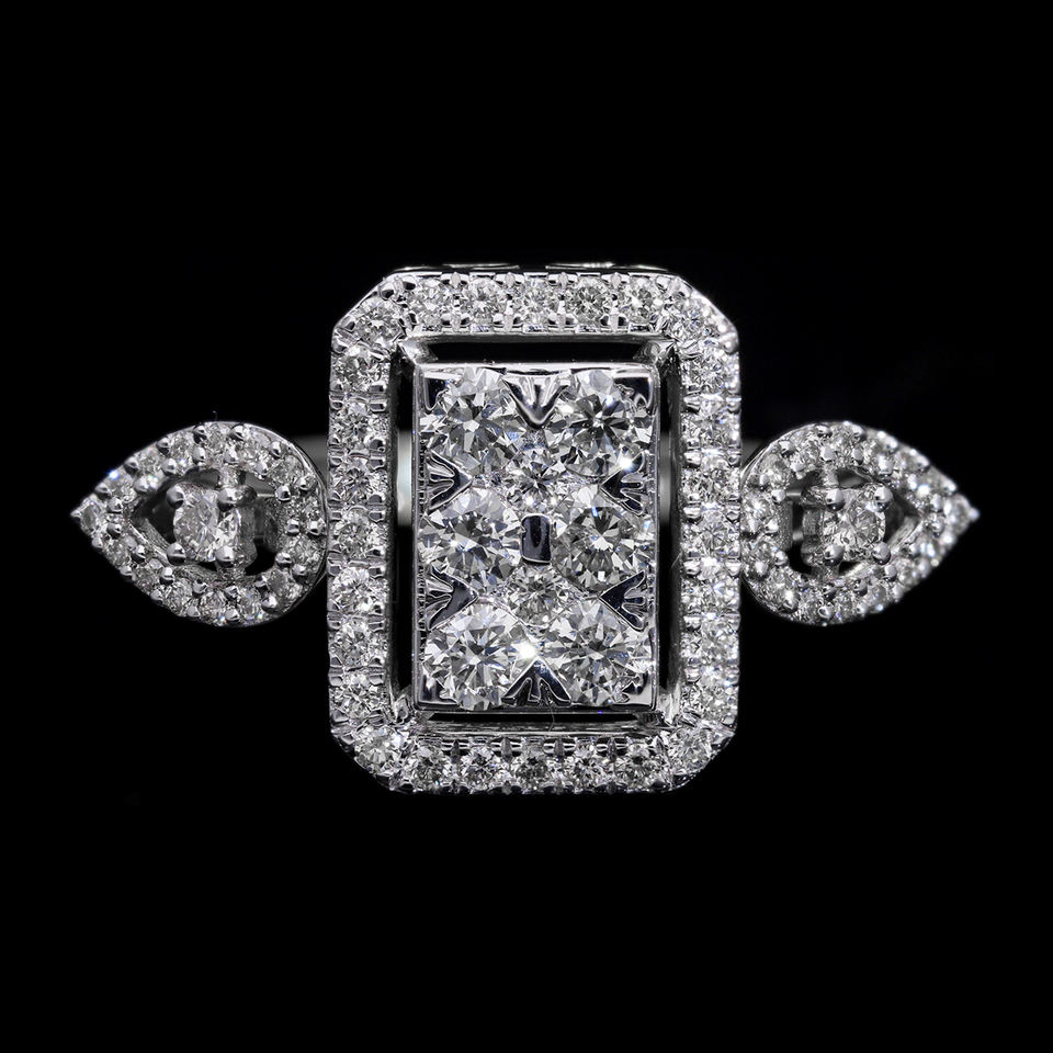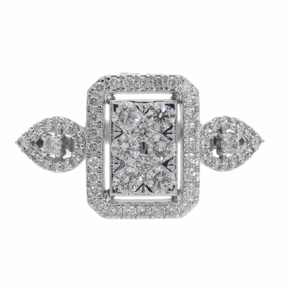 วงแหวนทรงเรขาคณิตสีขาวทอง14K พร้อมภาพลวงตาตัดมรกตและเพชรกลมธรรมชาติประดับด้วยรัศมีและรูปทรงลูกแพร์
