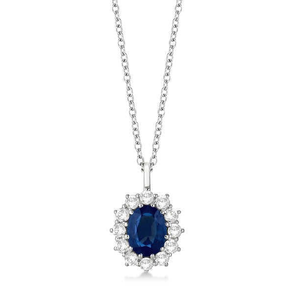 จี้สร้อยคอทองคำขาว 14K ประดับไพลินสีน้ำเงินทรงรีและเพชร 3.60 กะรัต จี้และชาร์มเพชร
