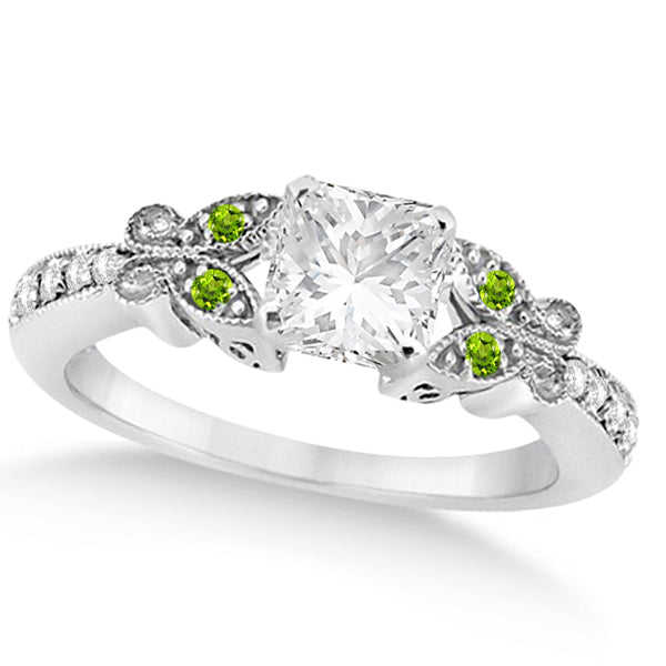 แหวนหมั้นเพชรทรงเจ้าหญิงและเพอริดอต 14K ทองคำขาว ประดับเพชร 1.00 กะรัต