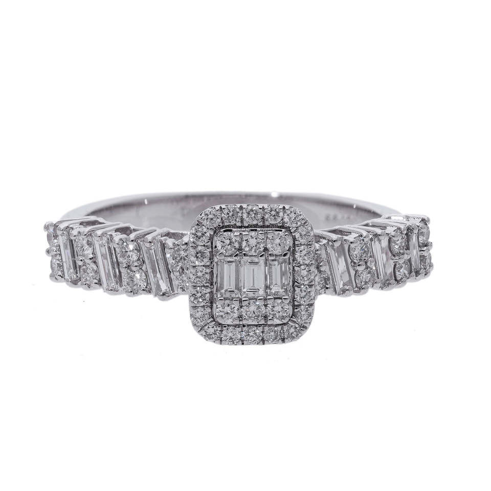 แหวนเพชรทรงรัศมีสำหรับผู้หญิง ทองคำขาว 14K ชุบโรเดียม ประดับเพชรทรงบาแกตต์ ดีไซน์วงแหวนสองชั้น