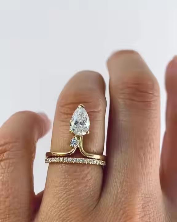 14K สีเหลืองทองแฮนด์เมดแหวนหมั้นทันสมัยชุดเพชรตัดลูกแพร์สำหรับแฟนสาวของขวัญวันครบรอบสำหรับเธอ