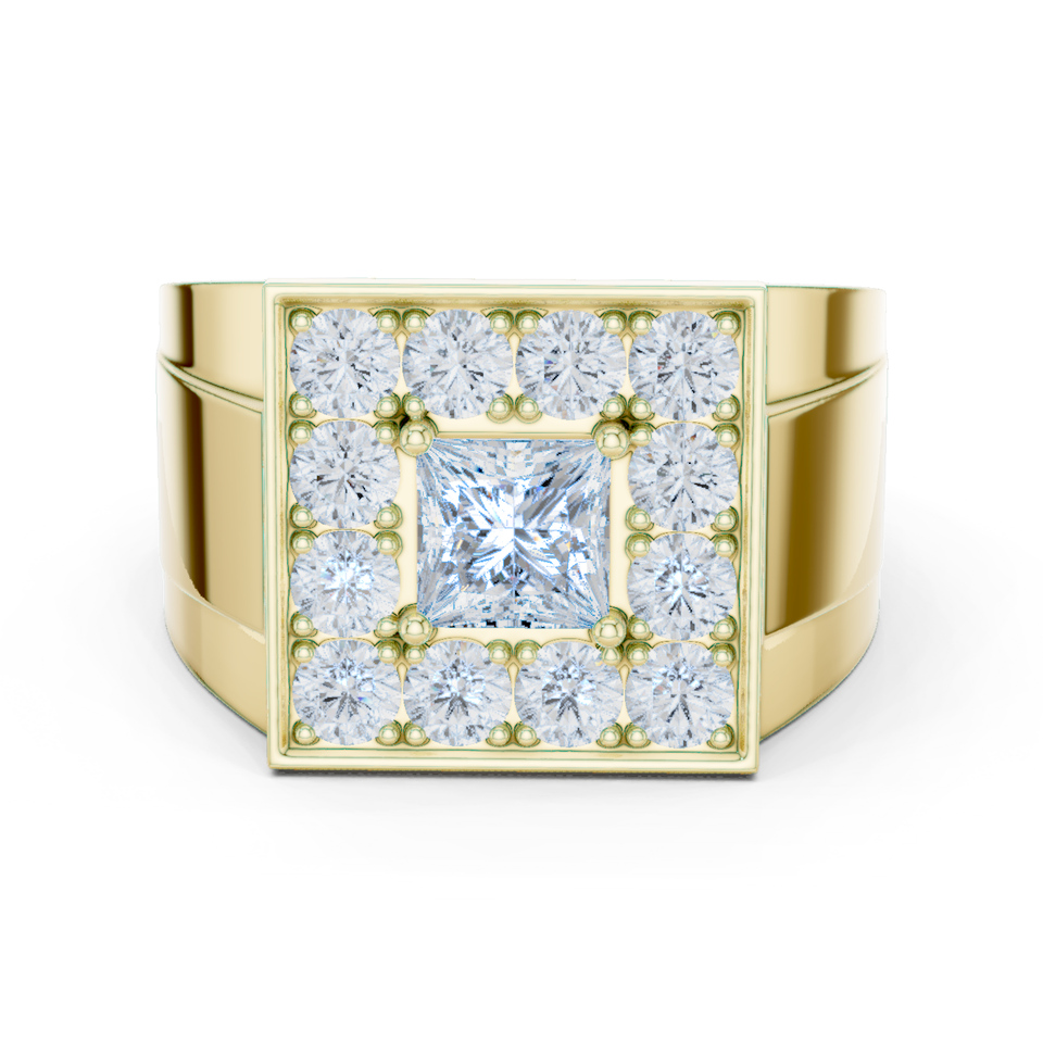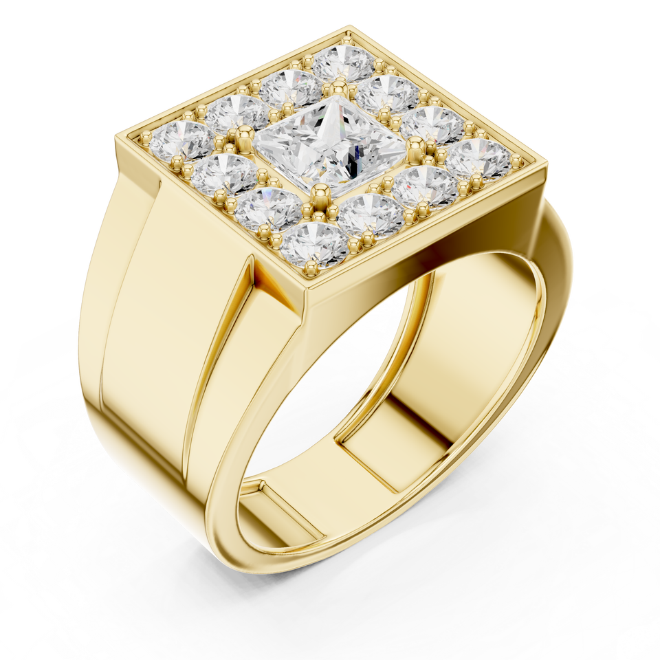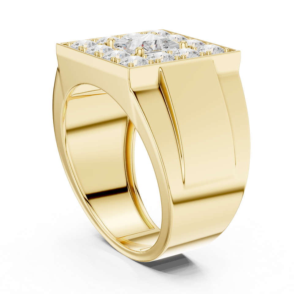 แหวนผู้ชายทองคำ 14K สีเหลือง ประดับมรกตสังเคราะห์ทรงเหลี่ยม ดีไซน์หรูหราทรงมงกุฎ ประดับเพชรแบบเฮโล