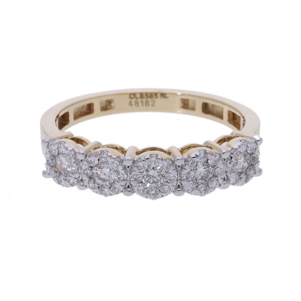 วงแหวนเพชรธรรมชาติสีทองสีเหลือง14K มีเพชรทรงกลมสไตล์คลัสเตอร์พร้อมการออกแบบให้เป็นรูปหอยเชลล์ที่สง่างาม