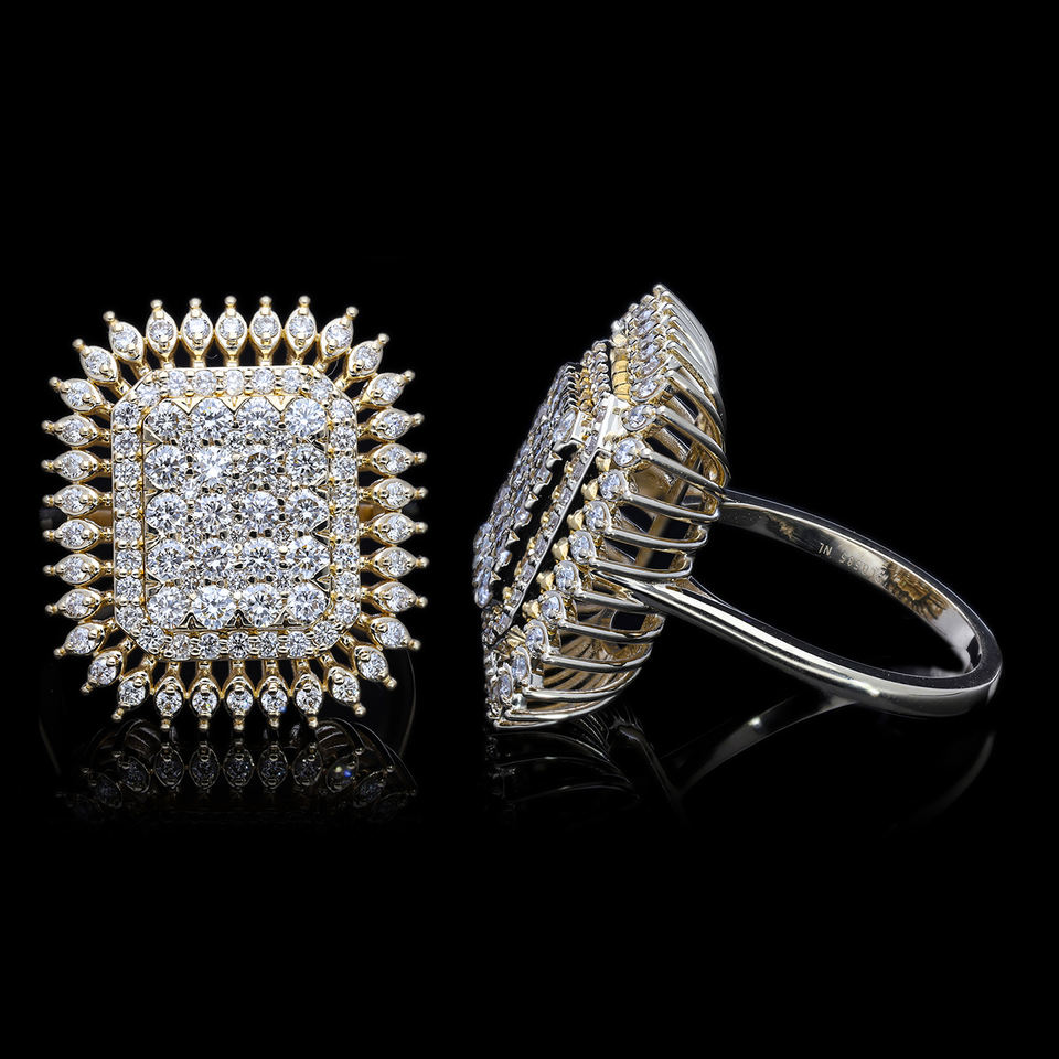 แหวนฮาโลทรงสี่เหลี่ยมมุมฉาก14K สีเหลืองทองพร้อมเพชรธรรมชาติและรัศมีลูกแพร์ทำในอินเดียโดยช่างอัญมณีผู้เชี่ยวชาญ