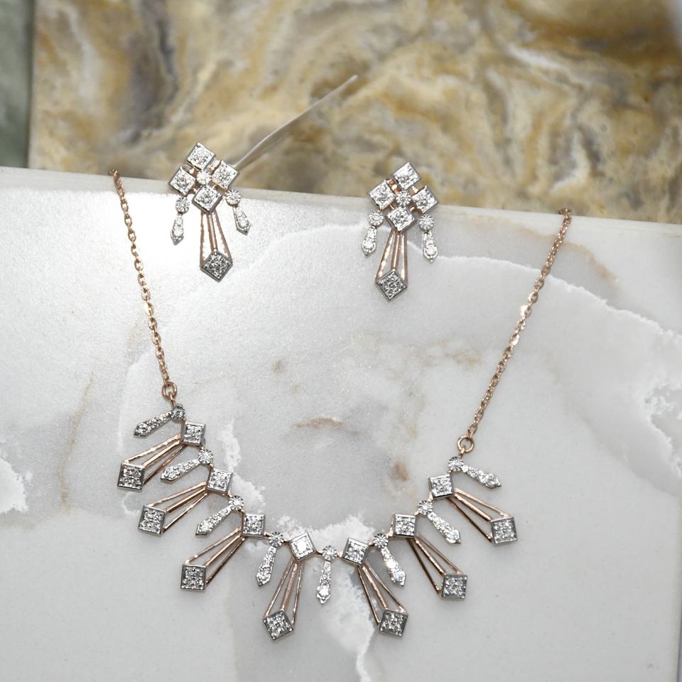 ชุดสร้อยคอและต่างหูทองคำแท้ 14KT ดีไซน์มินิมอล ประดับเพชรธรรมชาติทรงบริลเลียนท์ ได้รับการรับรองจาก IGI เหมาะสำหรับงานแต่งงาน งานหมั้น และงานเลี้ยง