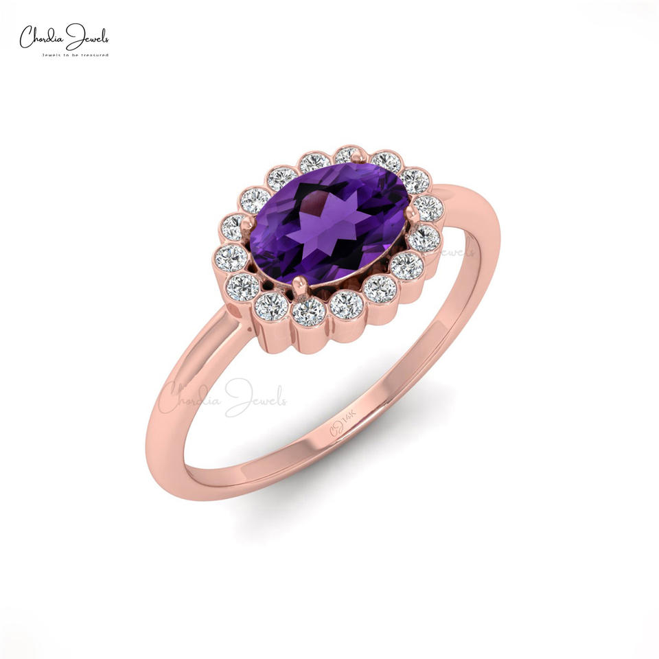 แหวนทองคำแท้ 14k ประดับพลอยแอฟริกันอเมทิสต์ทรงรี 7x5 มม. ฝังแบบหนามเตย พร้อมเพชรรอบพลอย งานแฮนด์เมด ผู้ขายขายส่งที่ได้รับการยืนยันแล้ว