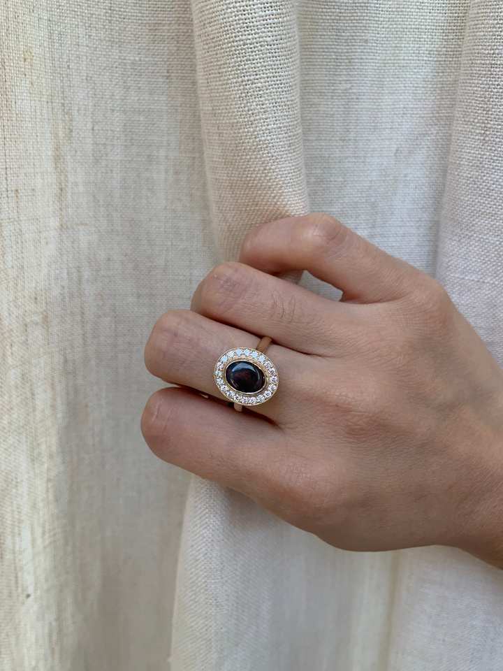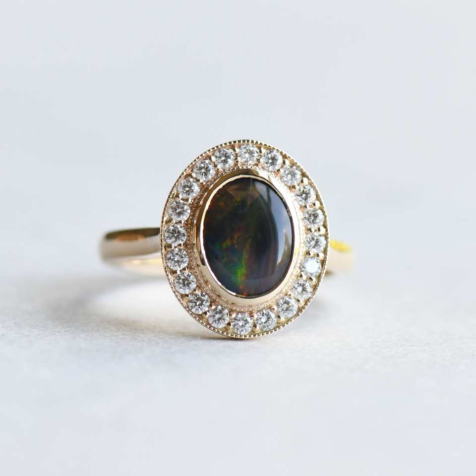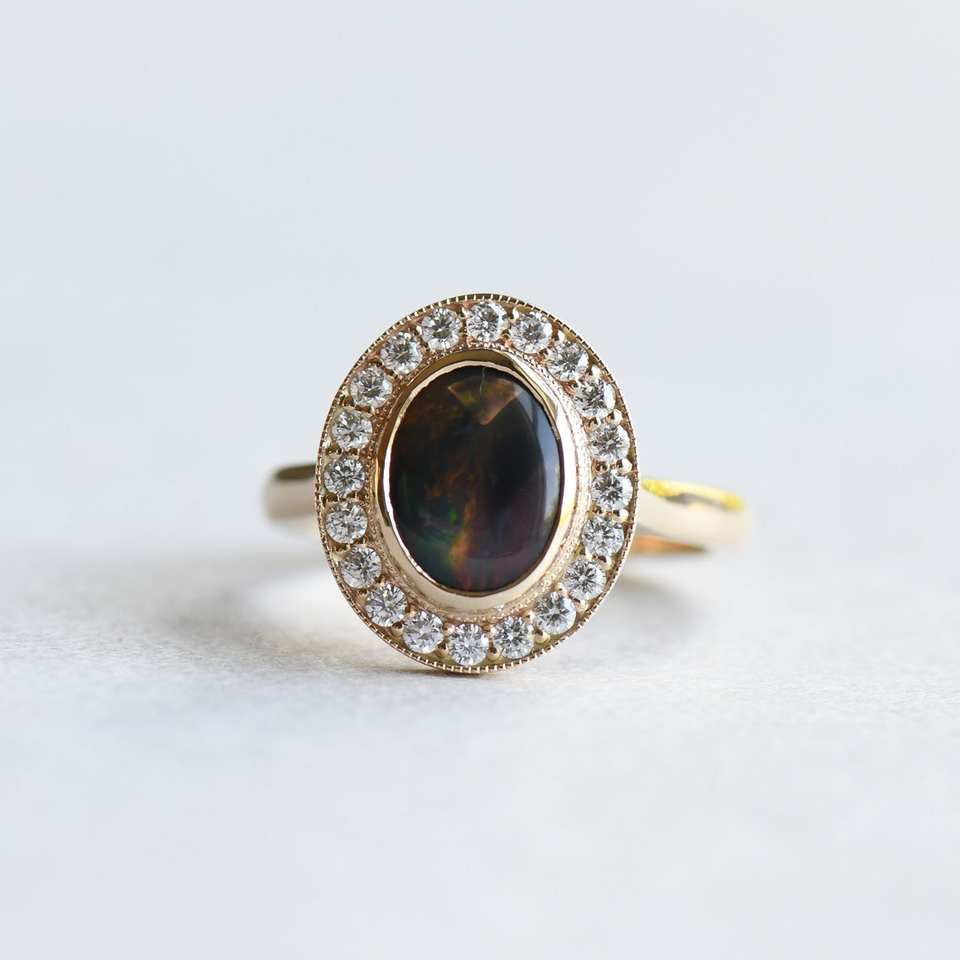 แหวนทองคำแท้ 14k ประดับโอปอลดำธรรมชาติจากออสเตรเลีย แหวนเพชรแท้ทรงวงรี ดีไซน์หรูหราสำหรับงานแต่งงาน