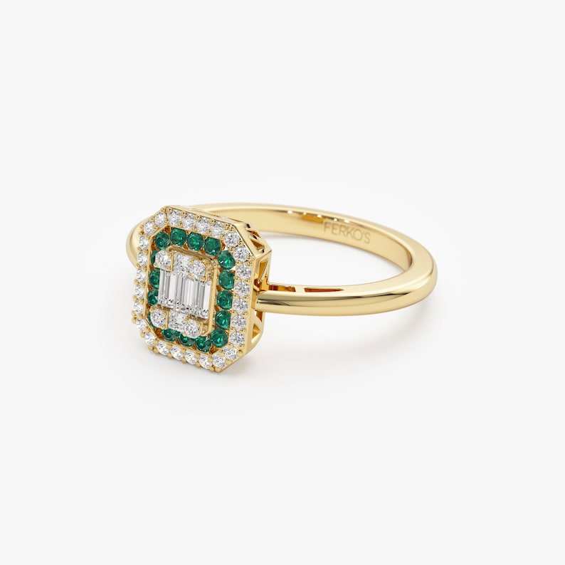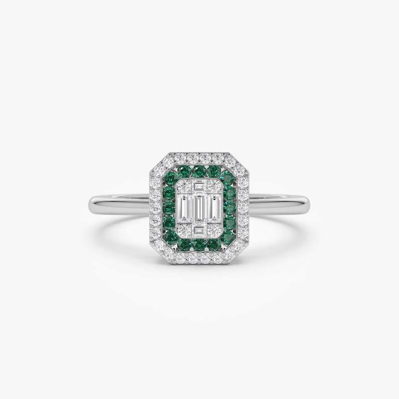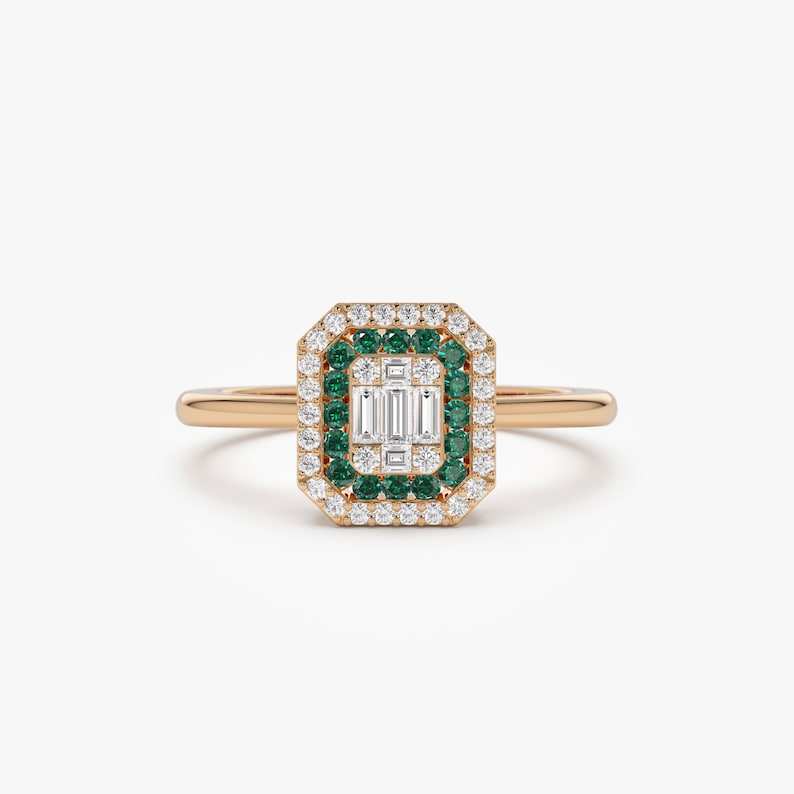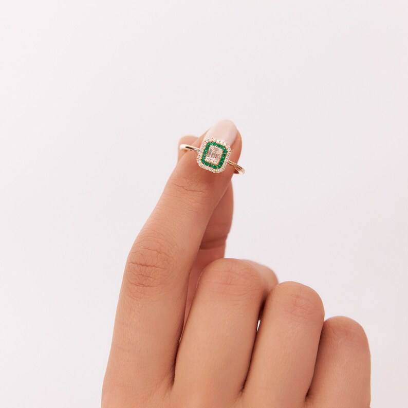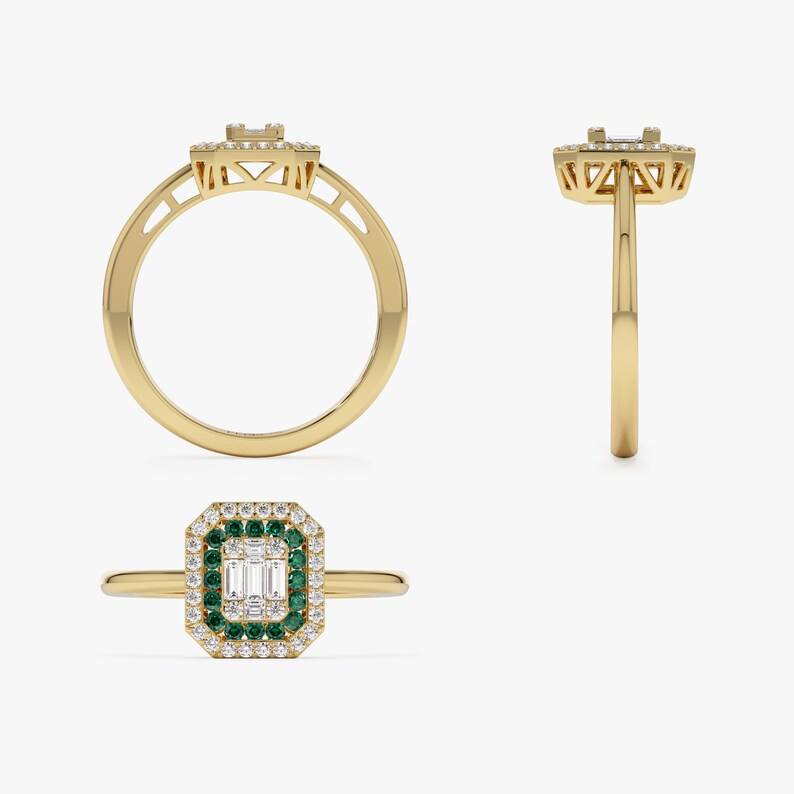 14K แหวนเพชรโมอิสฮาโลสไตล์วินเทจสีทองทึบแหวนมรกตตัดภาพลวงตาการตั้งค่าพฤษภาคมแหวนทองแต่งงานสำหรับผู้หญิงแหวนครบรอบ