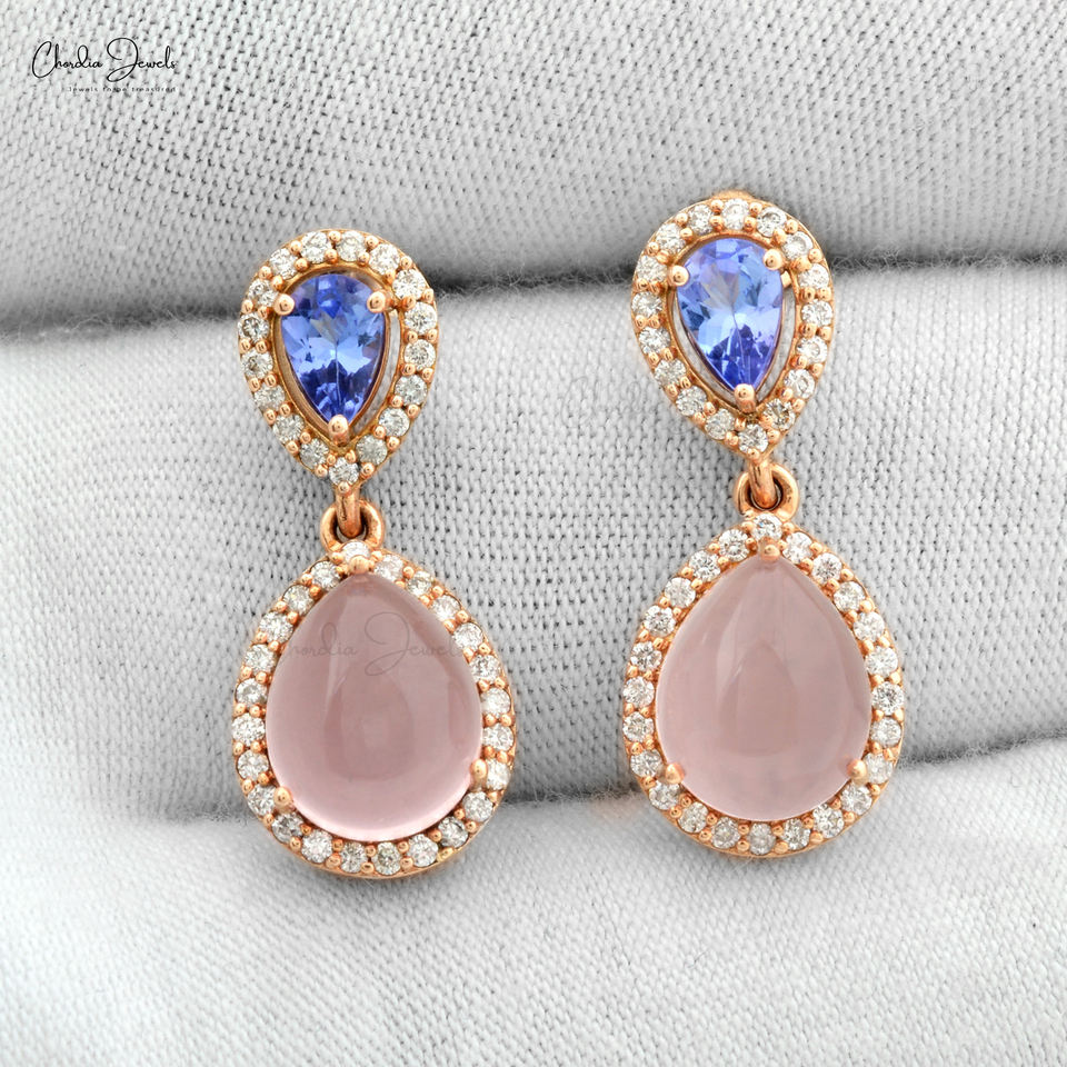ต่างหูทรงหยดน้ำสีโรสโกลด์14K ประดับเพชรพลอยรูปลูกแพร์ทำจากหินควอทซ์แทนซาไนต์แบบคลาสสิกของขวัญสำหรับงานเลี้ยง