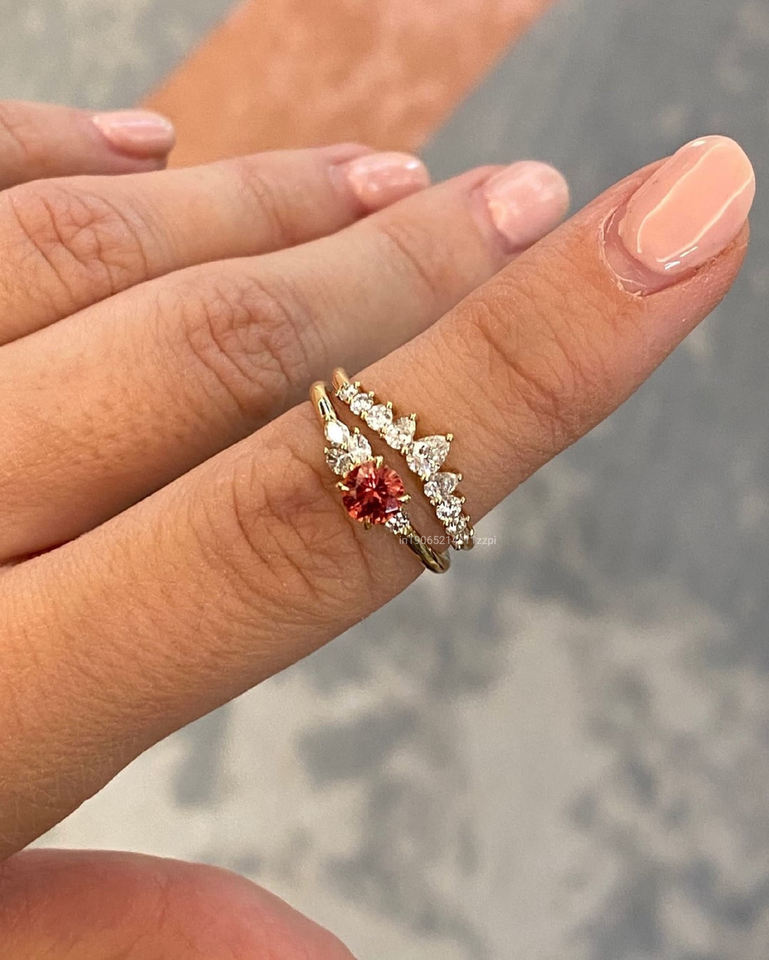 แหวนแต่งงานแบบโค้งลายอาร์ตเดคโคโรสีทอง14K พร้อมลูกแพร์0.45กะรัตและหินกลมเรียงซ้อน