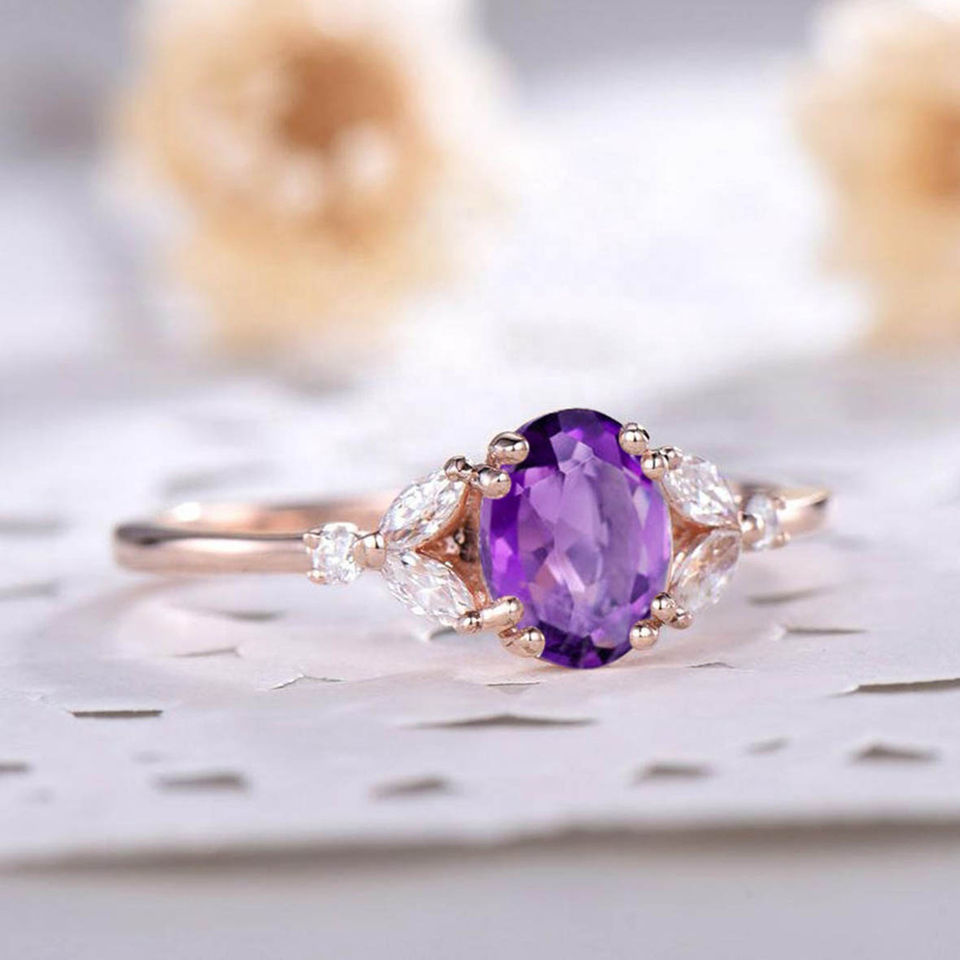 14k Sterling Silver Rose Gold Prong Set Marquise Natural Oval Amethyst Engagement Art Deco Style Women's Wedding Party Third