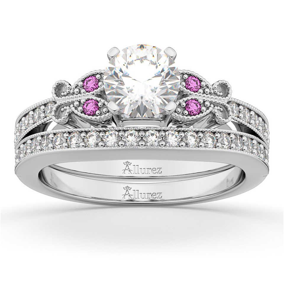 ชุดเครื่องประดับทองคำขาว 14k ประดับเพชรทรงเหลี่ยมมรกตรูปผีเสื้อและไพลินสีชมพูลายเรขาคณิต สำหรับงานแต่งงานหรือเป็นของขวัญ น้ำหนัก 0.42 กะรัต