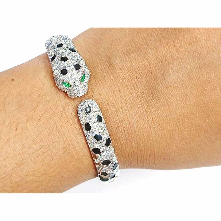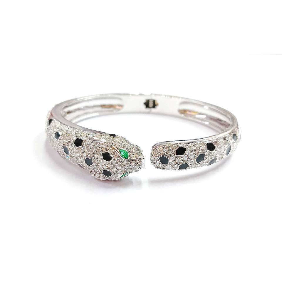 กำไลข้อมือเสือดำทองคำขาว14K กำไลข้อมือรูปสัตว์หรูหราทำด้วยมือจากมรกตและเพชร