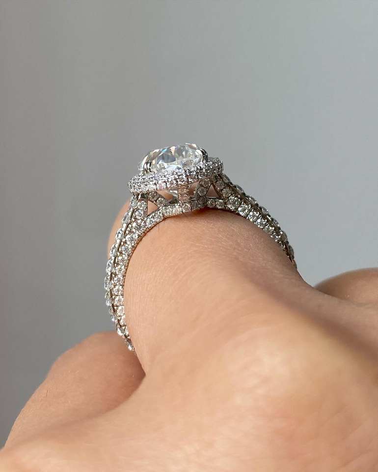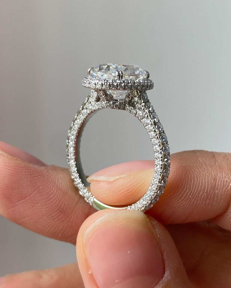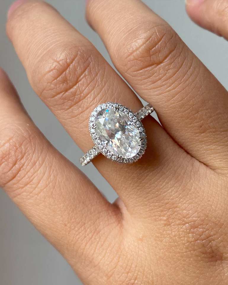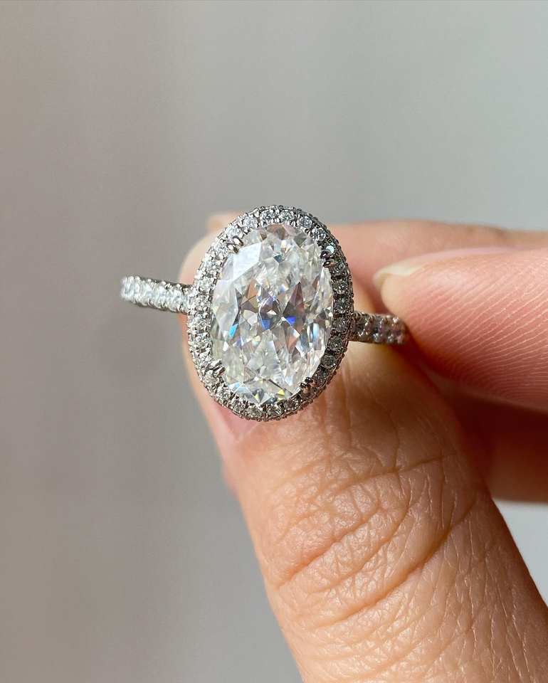 แหวนเพชรรูปวงรี14K สีเหลืองทองคลาสสิกซ่อนรัศมีแหวนหมั้น3.51CT VS1ไม่มีสีเพชรปลูกในห้องปฏิบัติการ