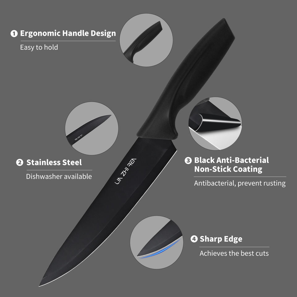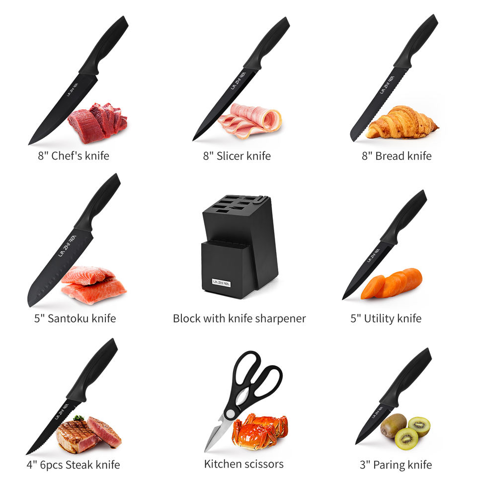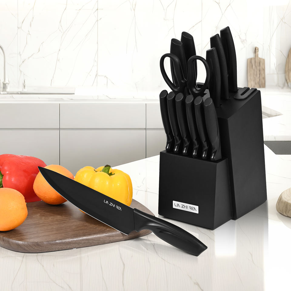 ชุดมีดทำครัวสแตนเลสสีดำ 15 ชิ้น ชุดมีดอเนกประสงค์สำหรับเชฟ หั่นขนมปัง ใช้ในครัว
