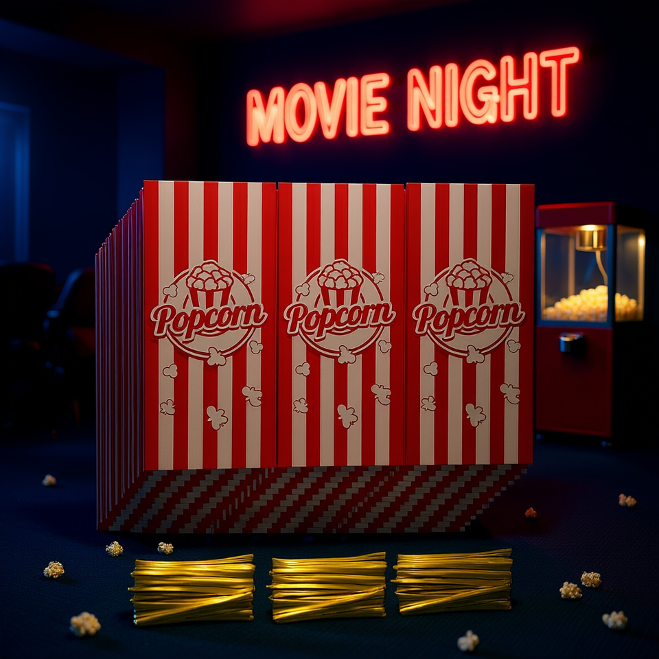 ถุงป๊อปคอร์น 150 ชิ้น ลายแดงขาว พลาสติก สำหรับงานดูหนัง งานปาร์ตี้ ใส่ขนม ของขวัญ พร้อมสายรัด สำหรับงานรื่นเริง คริสต์มาส