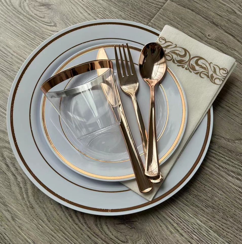 ชุดภาชนะอาหารสีโรสโกลด์150ชิ้นชุดจานอาหารค่ำพลาสติกแบบใช้แล้วทิ้งขอบสีโรสโกลด์25แพ็กสำหรับงานแต่งงาน