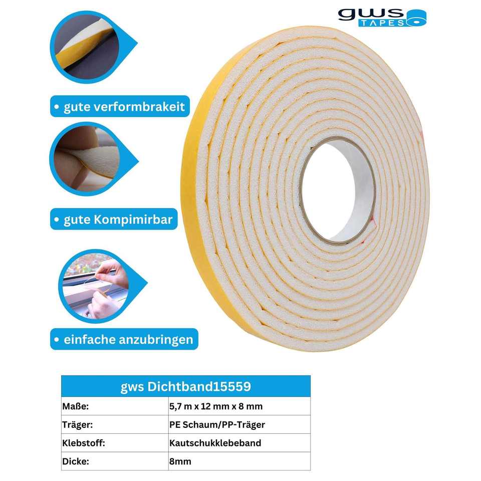 15559-102 GWS Sealing Tape Self-Adhesive PE Foam 12mm Width X 8mm Thickness X 5.7m Length Door & Window Accessories