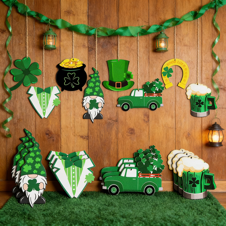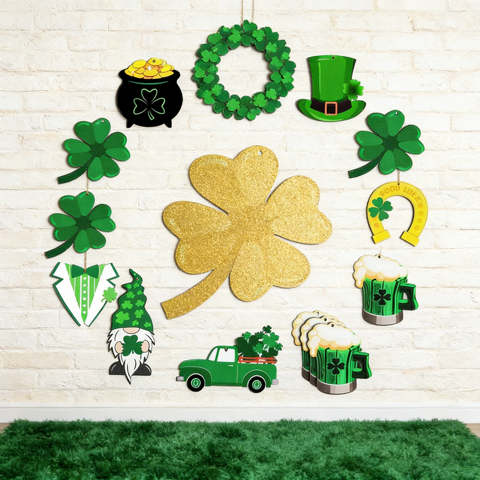 เครื่องประดับแขวนไม้ลายโคลเวอร์ 15 ชิ้น พร้อมลายตาราง จุด และคำมงคลนำโชค ด้วยเชือกปอกระเจาสำหรับตกแต่งผนังงานปาร์ตี้