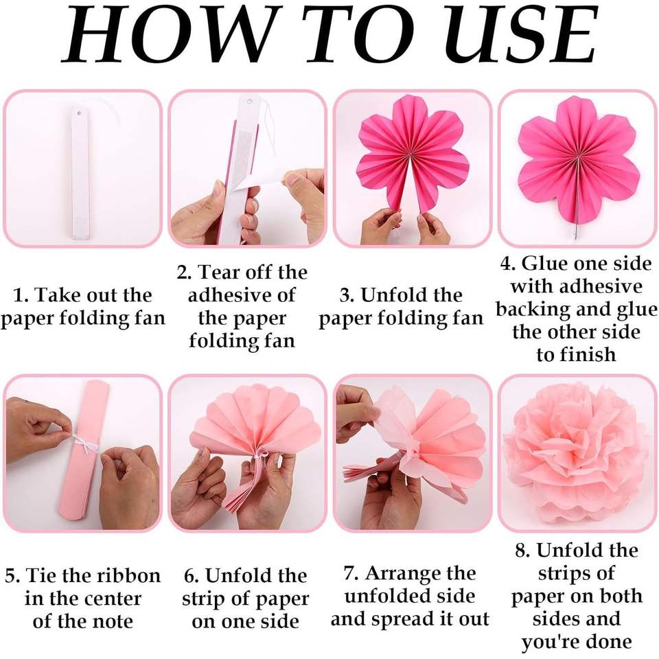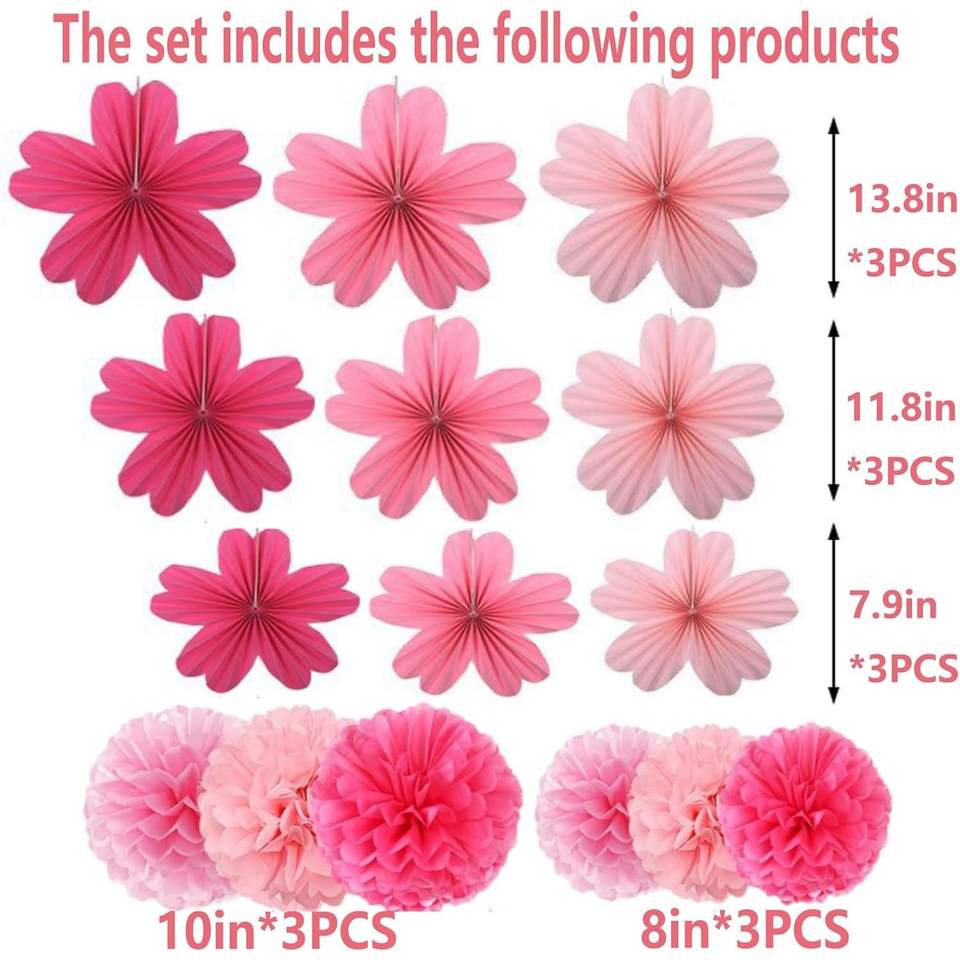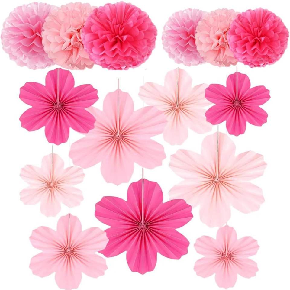 ชุดตกแต่งผนังพัดดอกไม้สีชมพูพาสเทล 15 ชิ้น และพู่กระดาษทิชชู สำหรับตกแต่งงานรับปริญญา วันเกิด งานแต่งงาน และงานปาร์ตี้