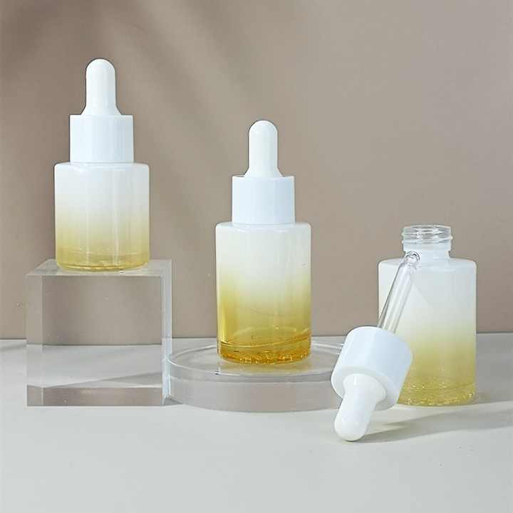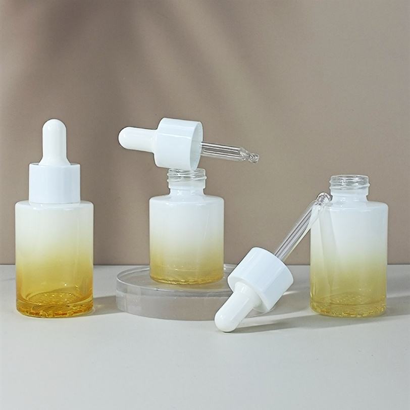 ขวดแก้วบรรจุภัณฑ์เครื่องสำอางสีเหลืองไล่เฉด ขนาด 15 มล. 30 มล. 1 ออนซ์ 60 มล. 2 ออนซ์ พร้อมหลอดหยดสำหรับบรรจุน้ำมันหอมระเหยและผลิตภัณฑ์บำรุงผิว