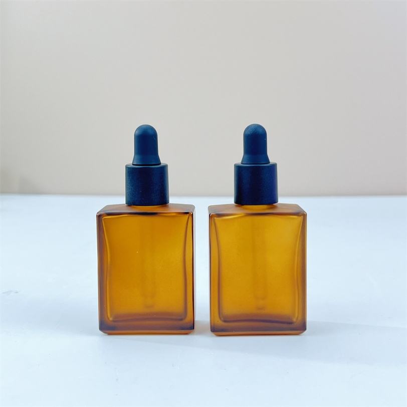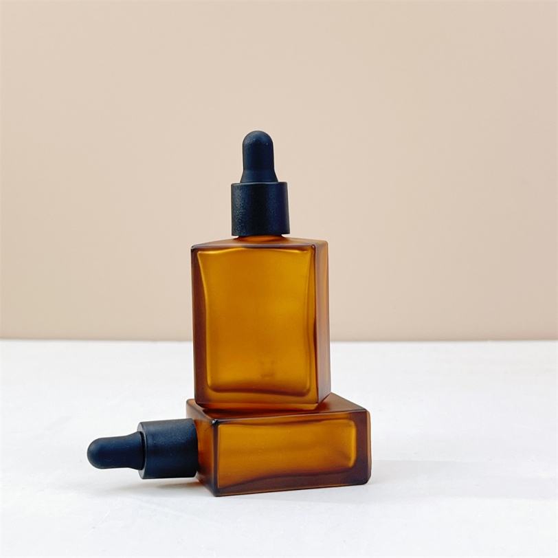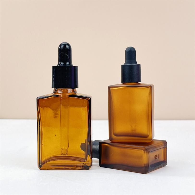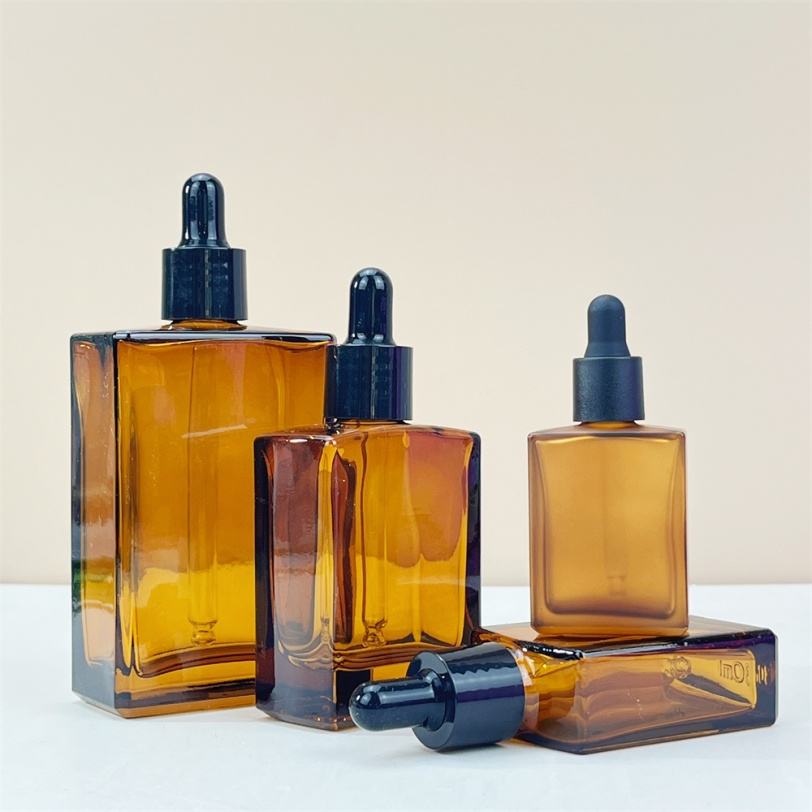 ขวดแก้วหยดทรงสี่เหลี่ยมแบนหรูหราขนาด 15 มล. 30 มล. 50 มล. 100 มล. สีน้ำตาลอำพันขุ่นพร้อมฝาหยด
