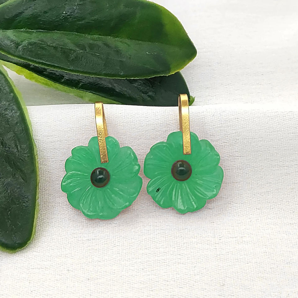 จี้แกะสลักลายดอกไม้จากหินออนิกซ์สีเขียวขนาด 15 มม. ชุบทองบนเงินแท้ 925 พร้อมหินกลางขนาด 3 มม. เครื่องประดับชั้นดี จี้แกะสลัก