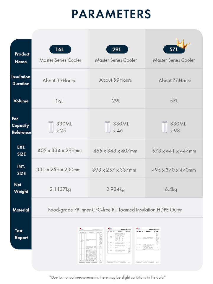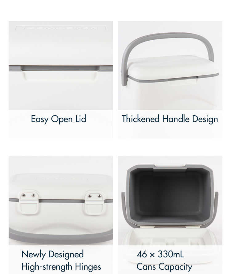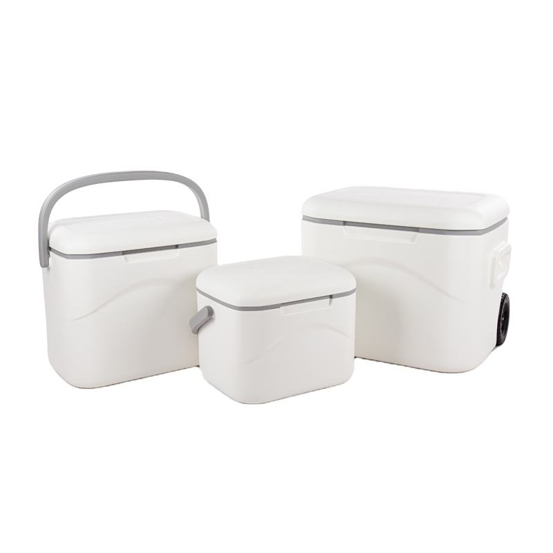 กล่องเก็บความเย็นแบบพกพาขนาด 16/29/57 ลิตร ทำจากพลาสติกอย่างดี ทนทาน ไม่แตกหัก เหมาะสำหรับไซต์ก่อสร้าง ฟาร์ม และงานกลางแจ้ง
